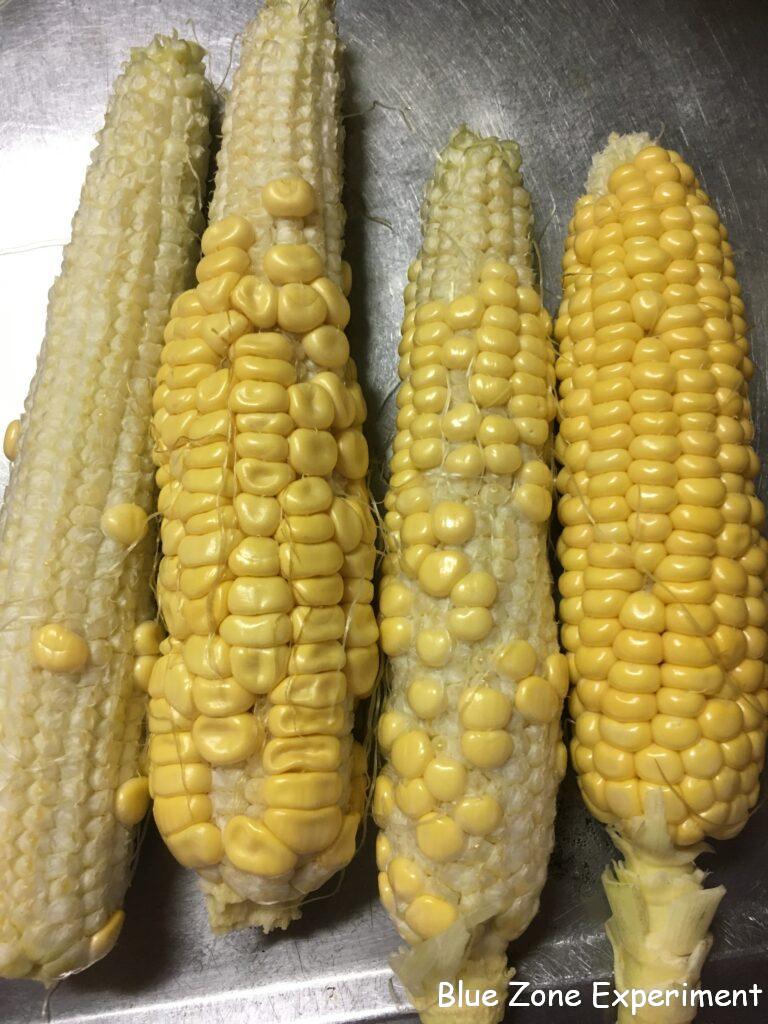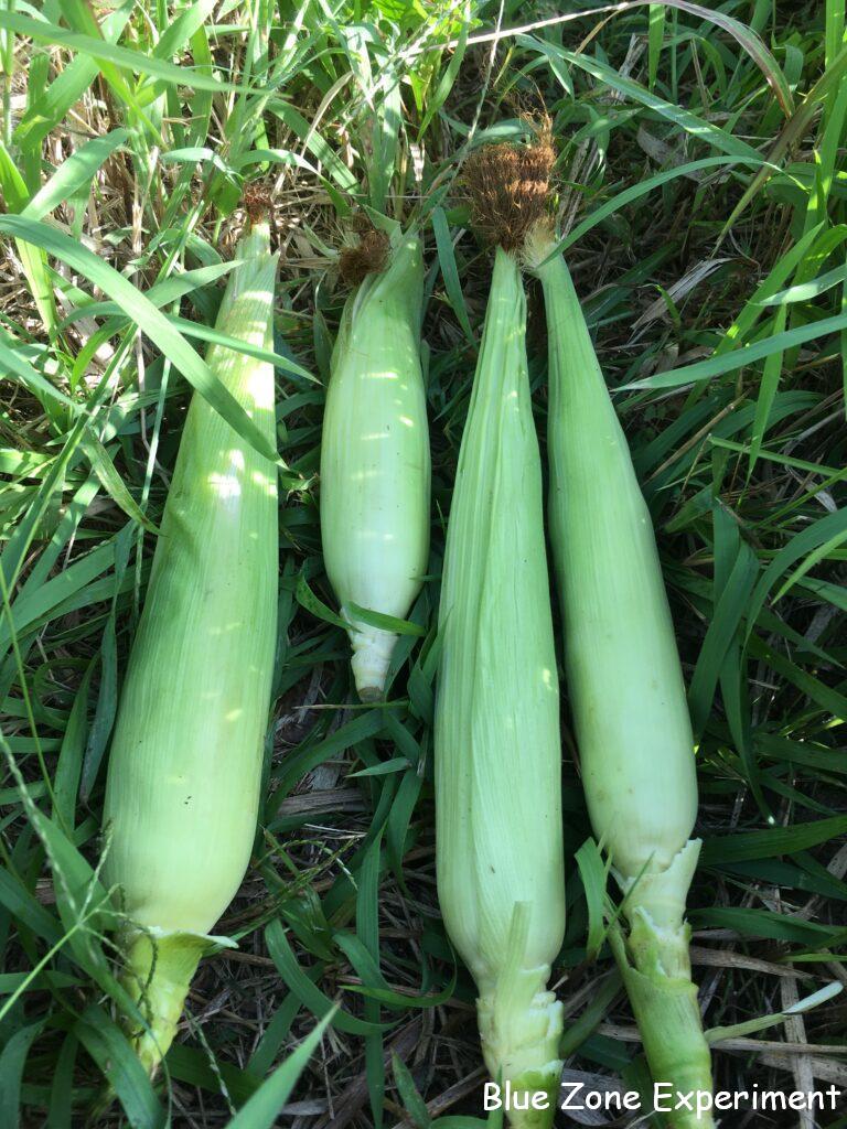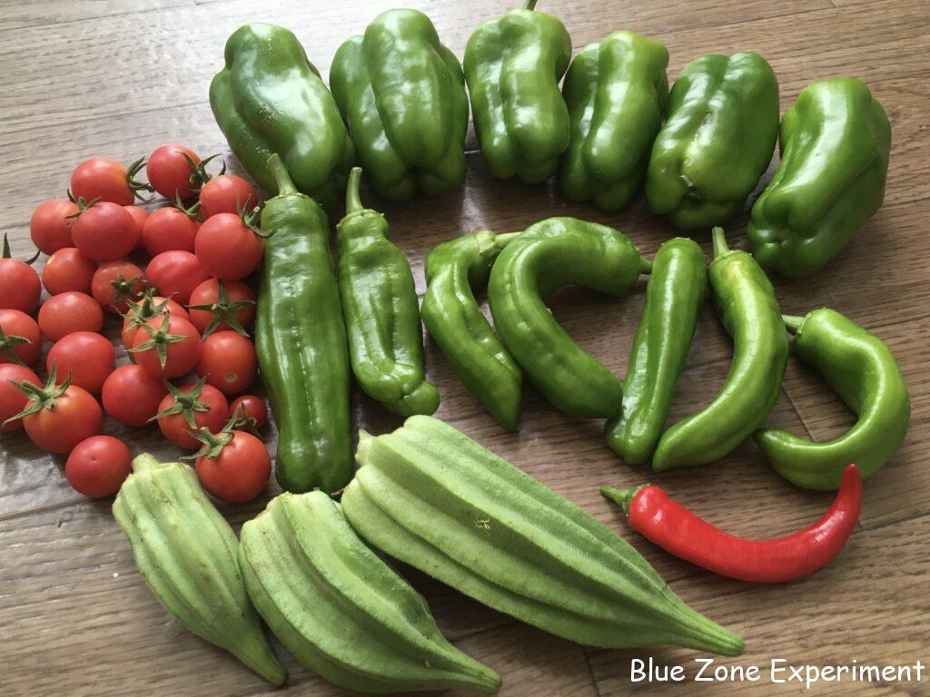もう一つの畑でも収穫しました。トウモロコシ、ピーマン、万願寺とうがらし、イタリアンミニトマト、マッツワイルドチェリートマト、オクラ(ダビデの星)です。トウモロコシを収獲するのははじめてなので、喜び勇んで皮をむいてみると、まともなのは一本だけで、あとはひどい状態……。トウモロコシは、まとめて何株も育てないと受粉がうまくいかないとのこと。種はそれなりにまいたのですが、発芽したあと草と間違って刈ってしまい、残ったのは 2 本だけだったので、ちゃんと受粉できていなかったようです。それでも、食べてみると甘くておいしかったので、収穫に間に合って、少しでも食べられただけで満足です! ピーマンは、貸農園の畑で育てているものと全く同じ品種ですが、大きさが全く違います! 大きく肉厚で、パプリカのような感じです。地力の差がはっきりとわかりました。ミニトマトは、蛾かカメムシに吸われているものが多く、あまり収穫できませんでした。オクラは、ダビデの星という品種で、収穫時期を逃して巨大化していました。大きくなってもやわらかいと聞いていたので、試しに茹でてみましたが、やはり硬くて食べられませんでした。それなら種用にとっておけばよかったです。