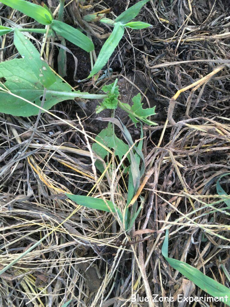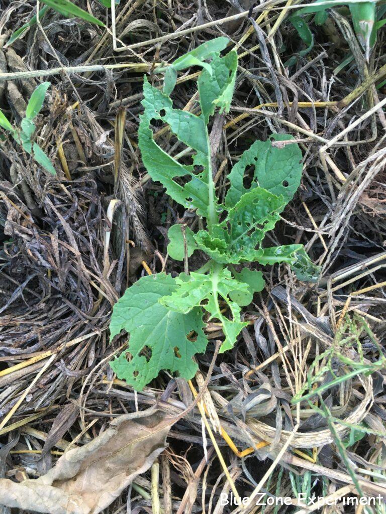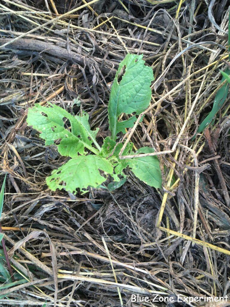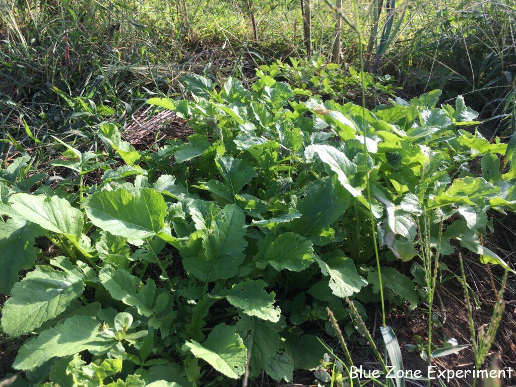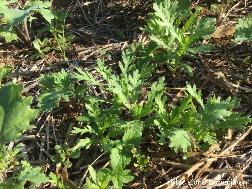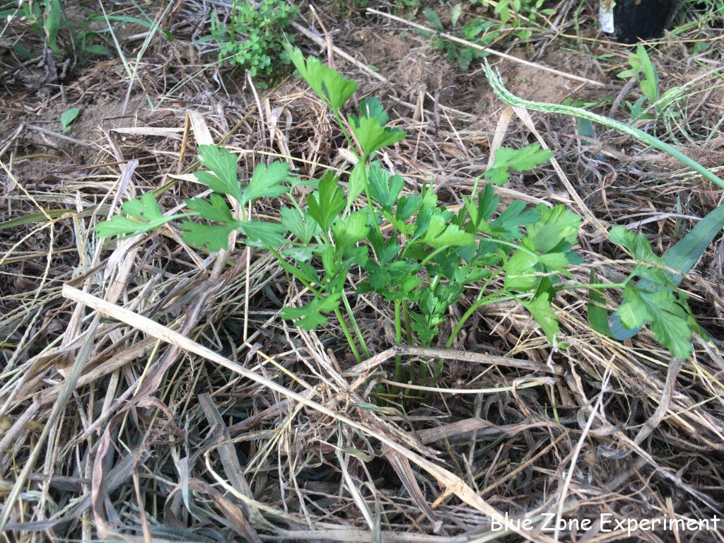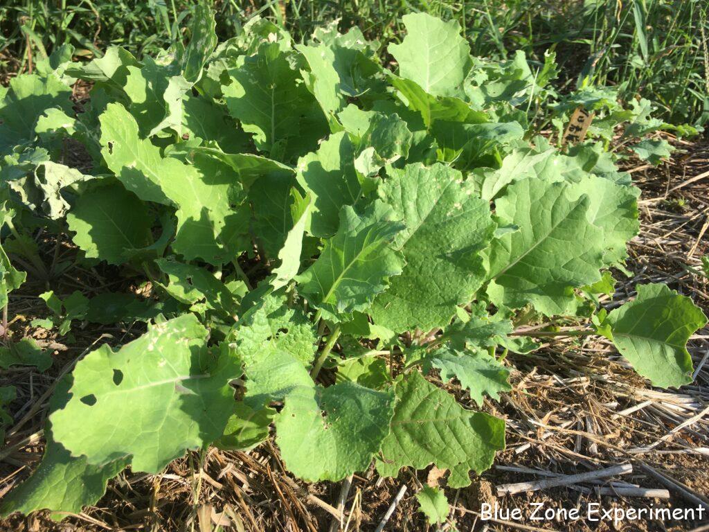 源助大根は虫に食われながらもよく成長しています。このくらい勢いがあれば、少々の虫食いは心配ありません。8 月 13 日に種をまいたので、ちょうど一か月になります。同じころに種をまいた宮重大根は、まだ比べ物にならないほど小さいです。同じアブラナ科のケールはよく育っています。こぼれ種が発芽したと思われるカツオナのようなものも混じっています。春菊は、同じくこぼれ種のレッドロシアンケールと一緒に元気に成長しています。3 日前に定植したイタリアンパセリは、すこぶる健康そうです。