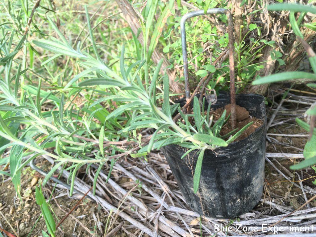 ローズマリーとタイムは、挿し木で増やすために、先日、穂先を切って水につけましたが、まだほとんど発根していません。今日は、圧条法を試してみようと思います。この方法では、挿し木のように枝を切り離さず、その代わり、枝の途中を土に埋めて発根させます。ポリポットに土を入れて、届く場所にある枝を土に埋めてみました。クリップなどで留めた方がいいようですが、持っていなかったので埋めただけです。この方法ははじめてですが、挿し木よりも確実に根付きそうなので楽しみです。