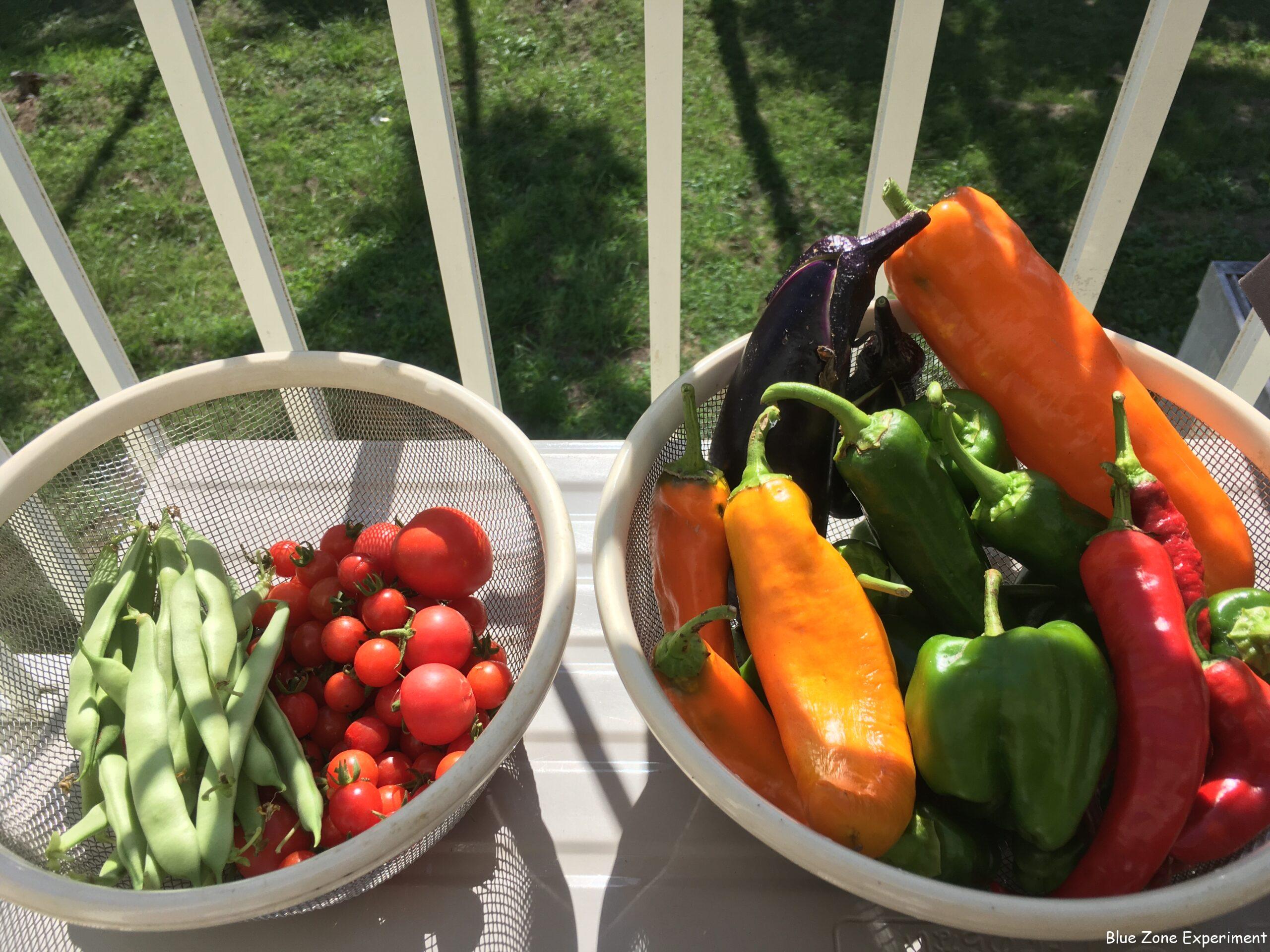 今日の収獲は、さやインゲン、ミニトマト、ナス、パレルモ、万願寺トウガラシ、伏見甘長トウガラシ、ピーマンです。大量ではありませんが、一人で食べるには十分です。