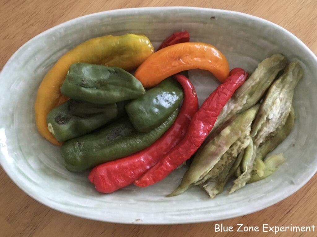 トウガラシ類とナスをフライパンで蒸し焼きにしました。ナスは、焼きナスの要領で皮をむきます。さやインゲンは茹でただけ。野菜本来の味を楽しむためには、シンプルな料理方法が一番です。しょうゆ麹を少しつけながらいただきました。