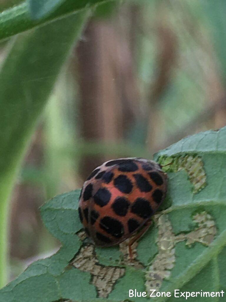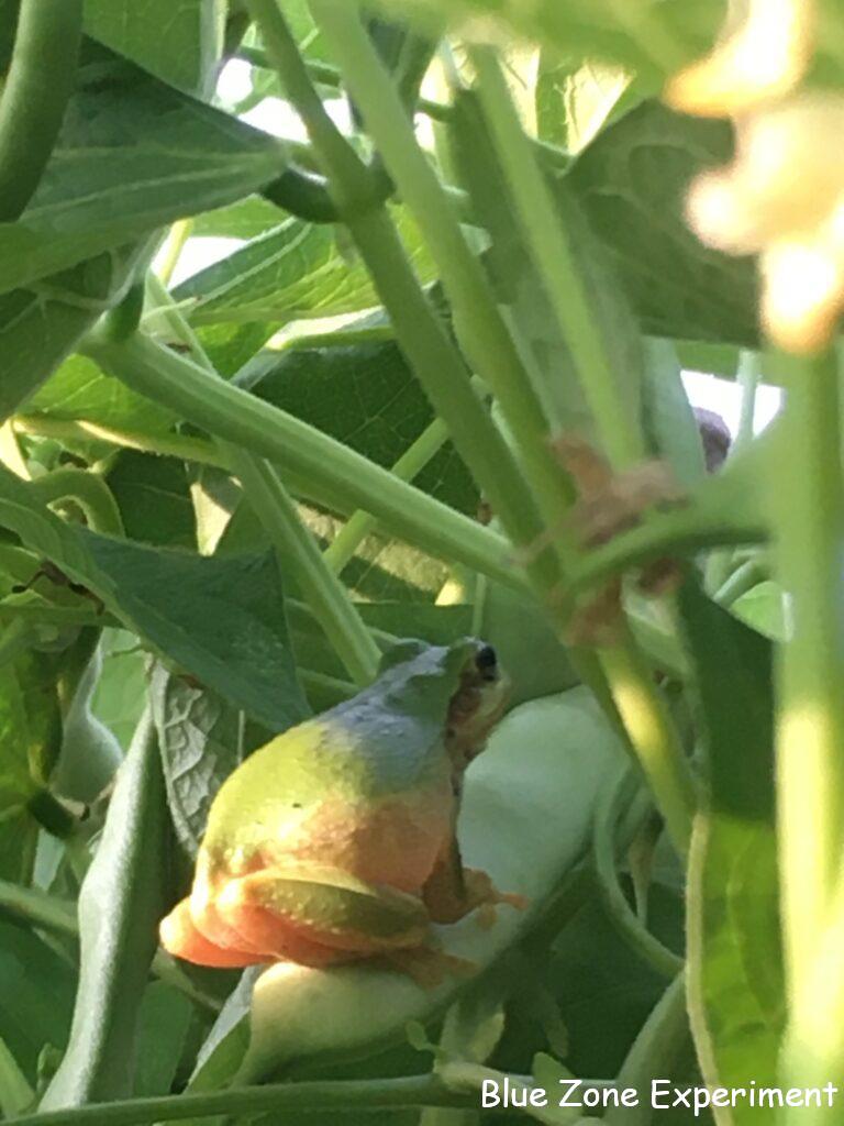 夏野菜が弱ってきて、テントウムシダマシが増えています。葉っぱだけならいいのですが、ナスやトウガラシ類の実もかじってしまうのが困ったところです。白インゲンの莢に、とても大きなお腹をしたカエルがのっていました。一体何を食べたのでしょうか? 頼もしい限りです!