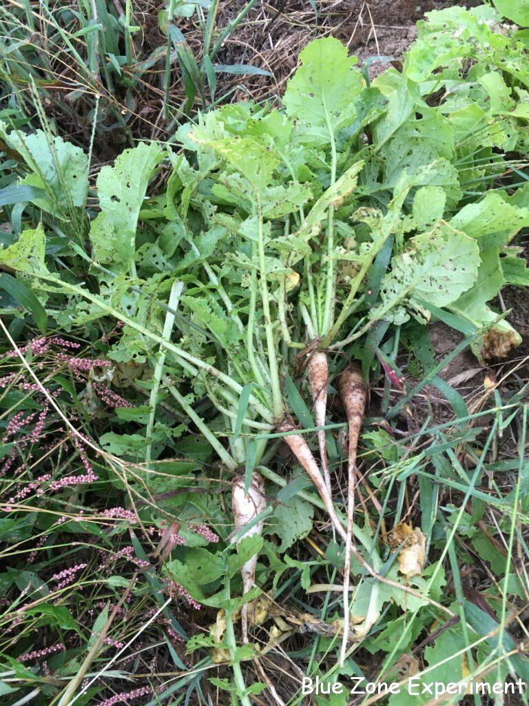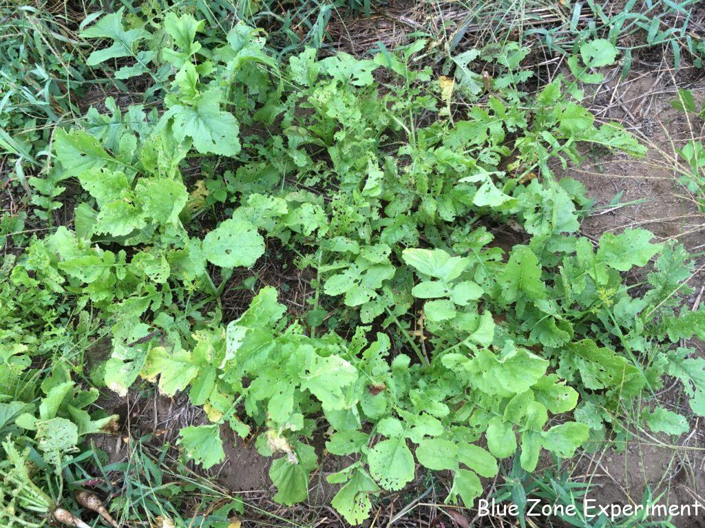 源助大根は、初期は虫食いもなく調子がよかったのですが、ダイコンサルハムシに見つかってしまったようで、最近は食害がひどいです。そうはいっても、すでにある程度成長しているので、全滅させられる心配はなさそうです。密になっていると成長しにくく、余計に虫に狙われそうなので、少し間引くことにしました。残念ながら、葉っぱはボロボロで食べる気になれませんが、小さな大根は何かに使おうと思います。