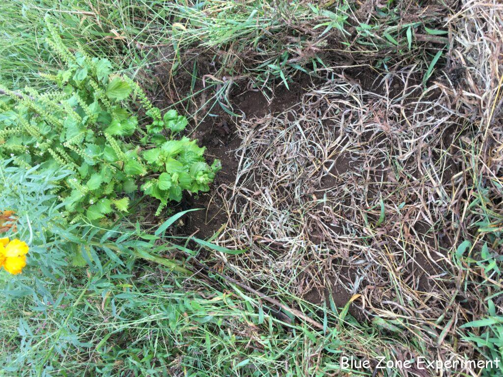 畑のあちこちで大きく成長しているアフリカンマリーゴールドは、まだ咲き続けている株もあれば、もう終わりに近づいているものもあります。隣との境界に植えて壁のようになっていた一群は、もう花の時期を終えつつあります。あとは種取りです。ちなみにアフリカンマリーゴールドのうしろにさらに高くそびえたつ黄色い花は、隣の畑のキクイモです。2 メートルは軽く超えるなかなかの長身です。