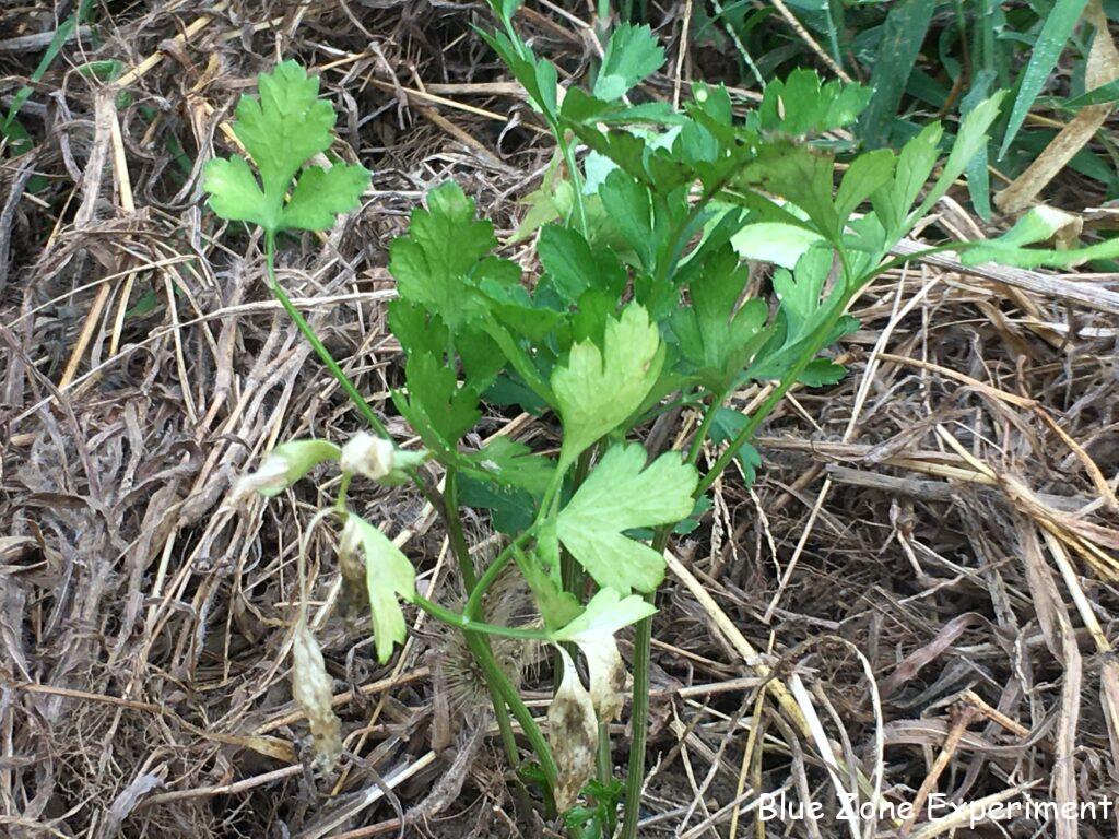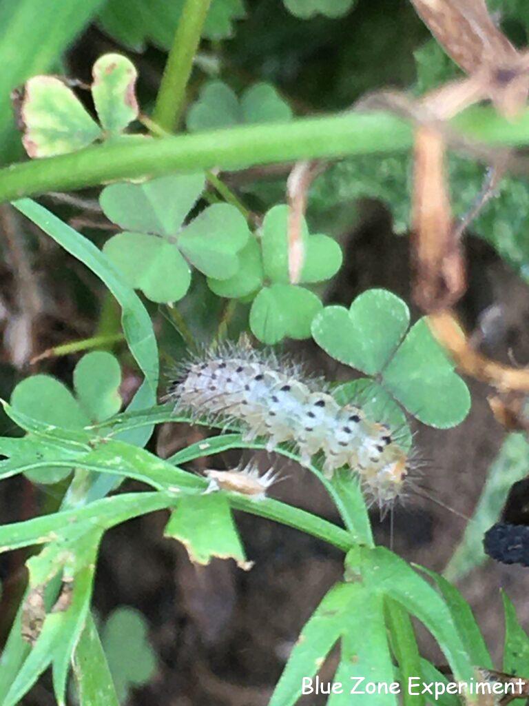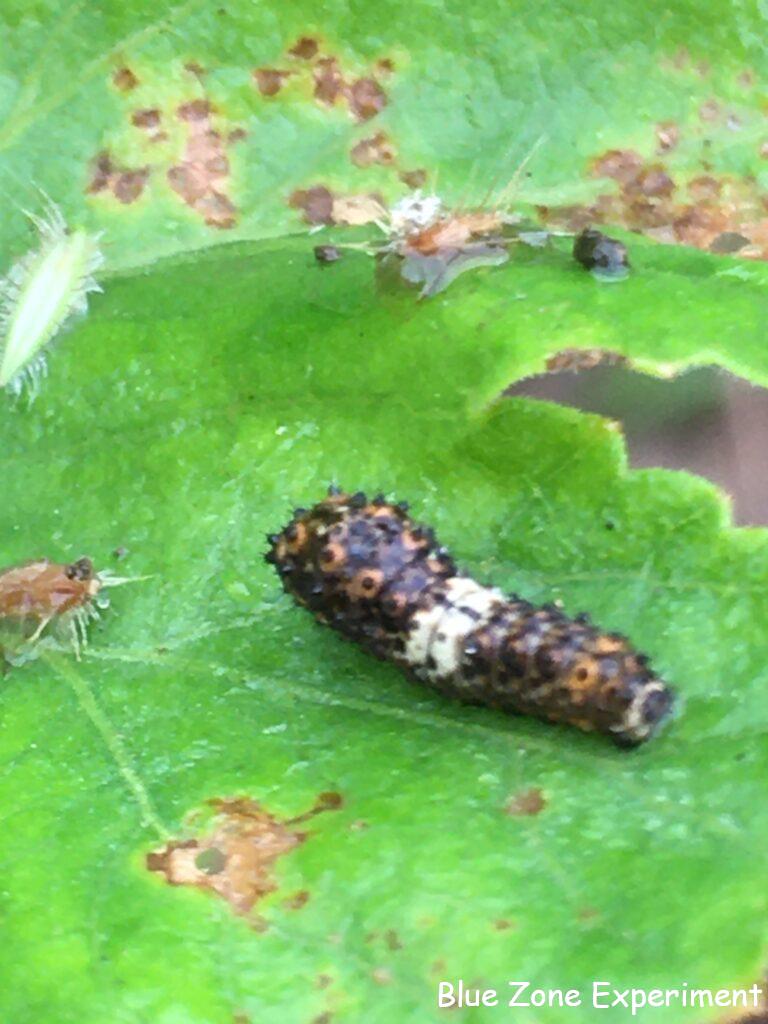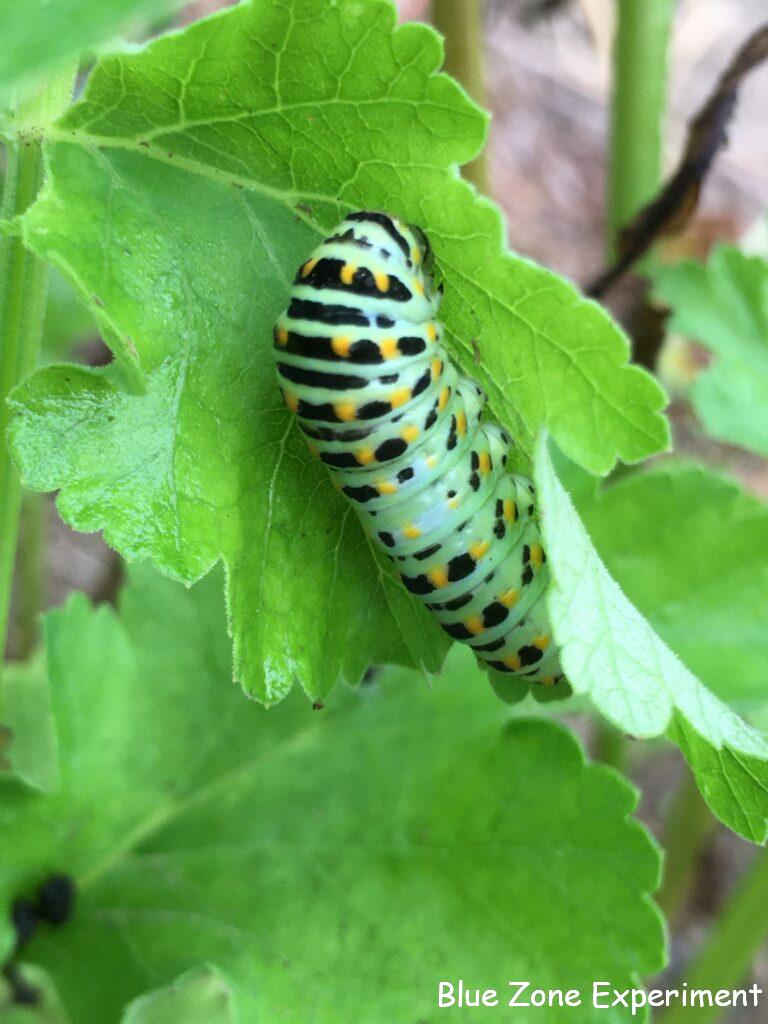 パースニップにまたキアゲハの幼虫が……しかも二匹。前回も一匹見つけてニンジンに引っ越ししましたが、また新たな二匹をニンジンに移動させることになりました。せっかく育っていたニンジンには、本当に申し訳ないことです。前にニンジンに移動させた終齢の幼虫はいなくなっていたので、蛹になったと思われます。キアゲハは畑では見かけることがあまりないのですが、一体いつ卵を産みに来ているのでしょうか? ニンジンには、また別の虫もついていました。謎の毛虫です。これは、よそに行ってもらいました。