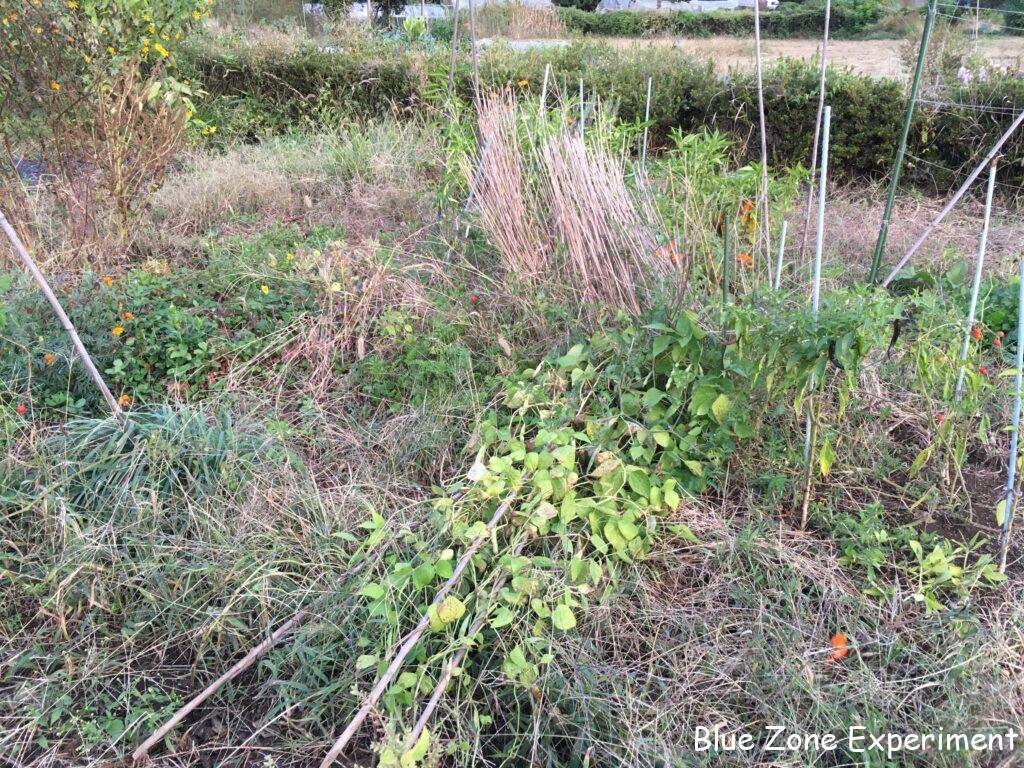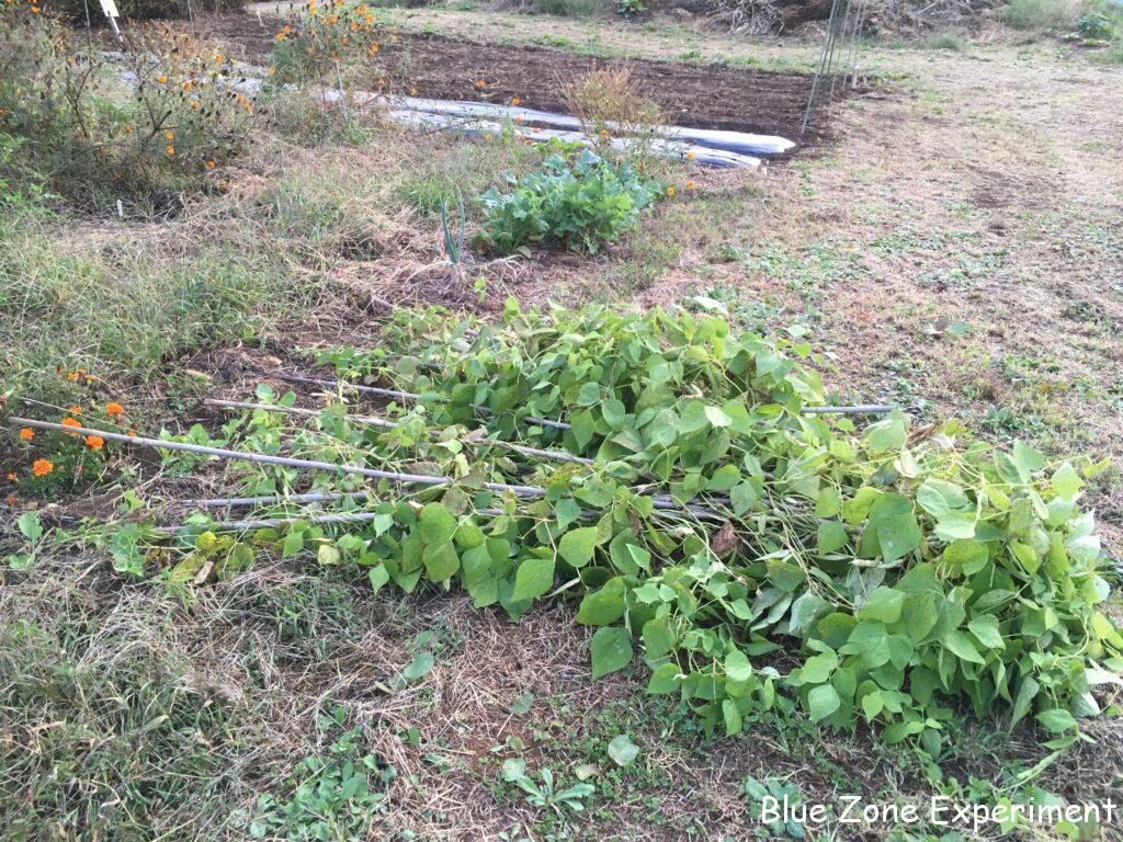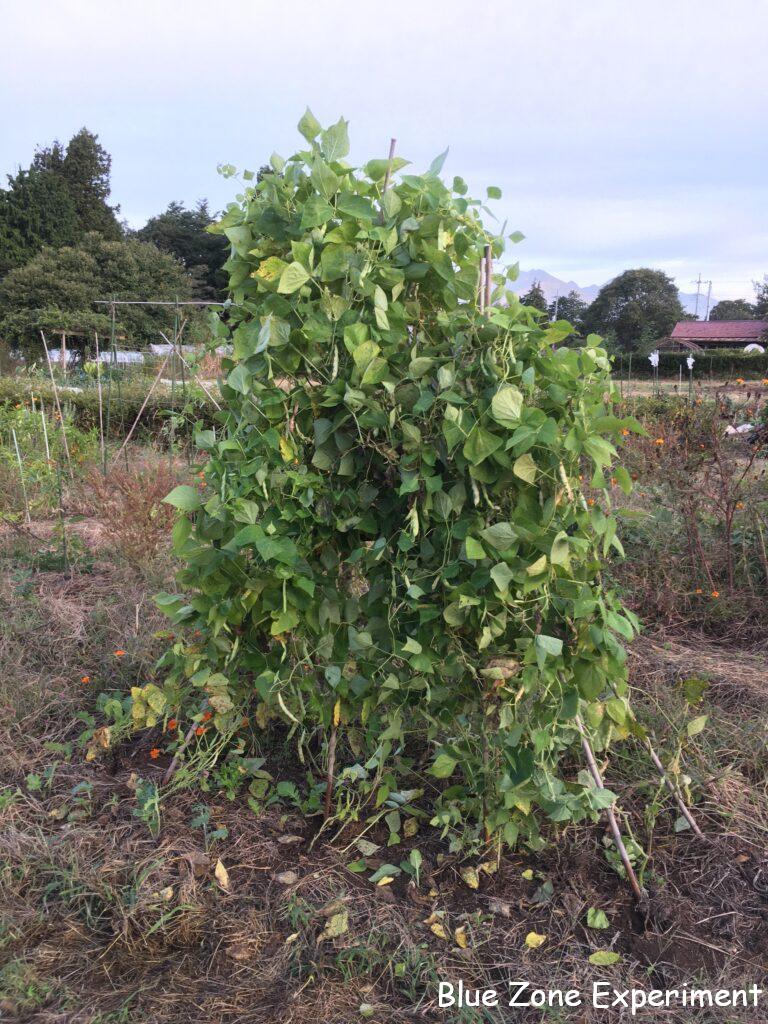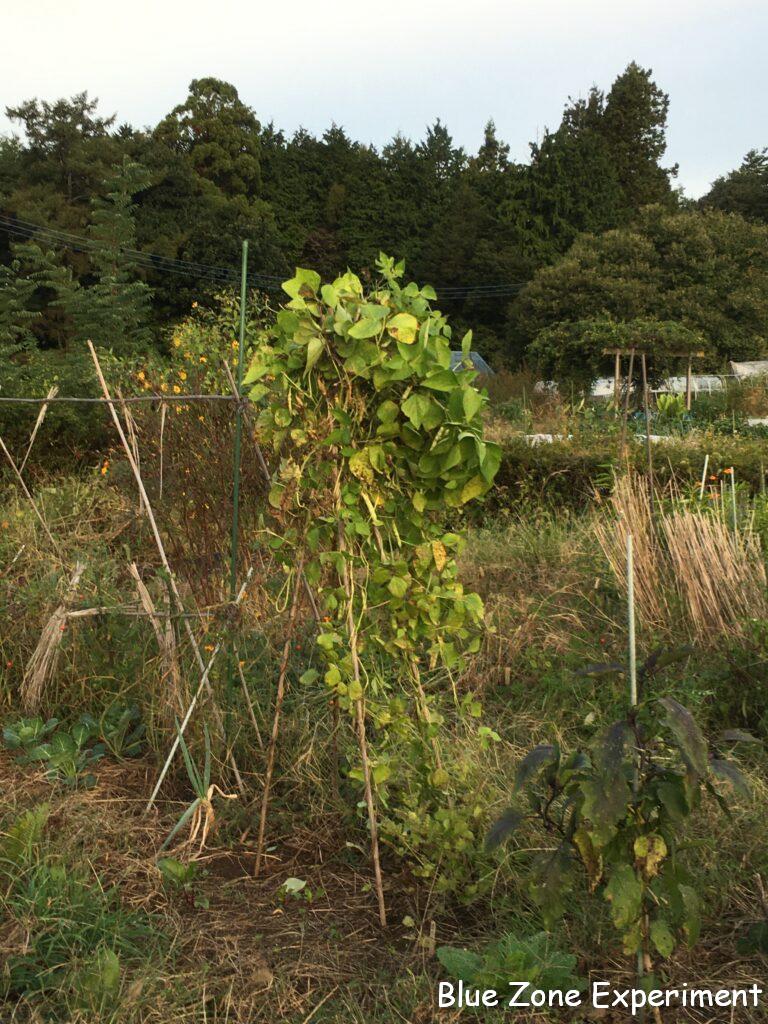 立て直しましたが、ちょっとぐらついています。さやインゲンとしてはもう収穫していないので、豆が大きくなるまで、なんとか持ちこたえてもらいたいものです。