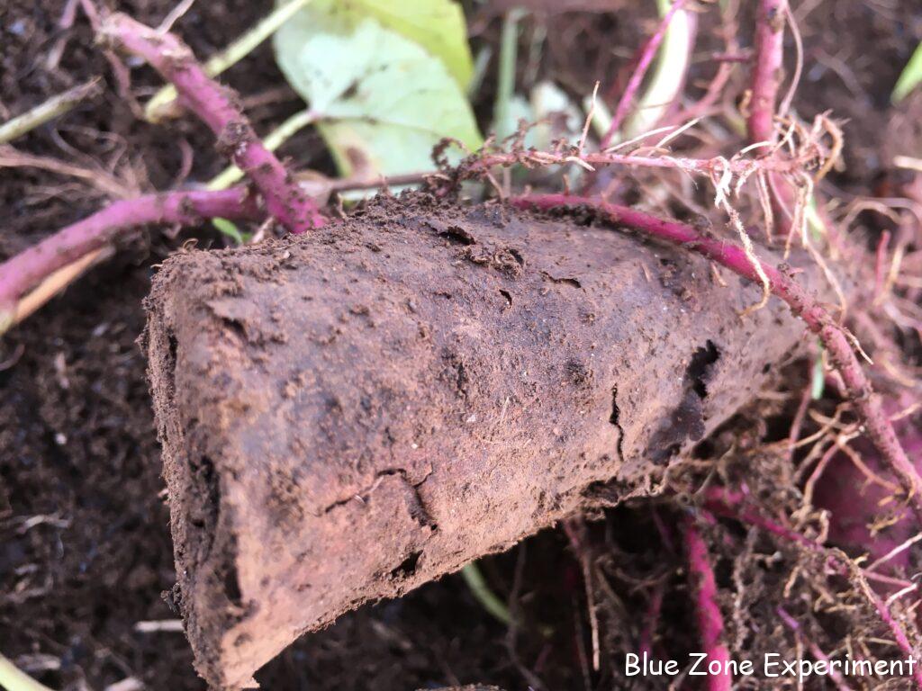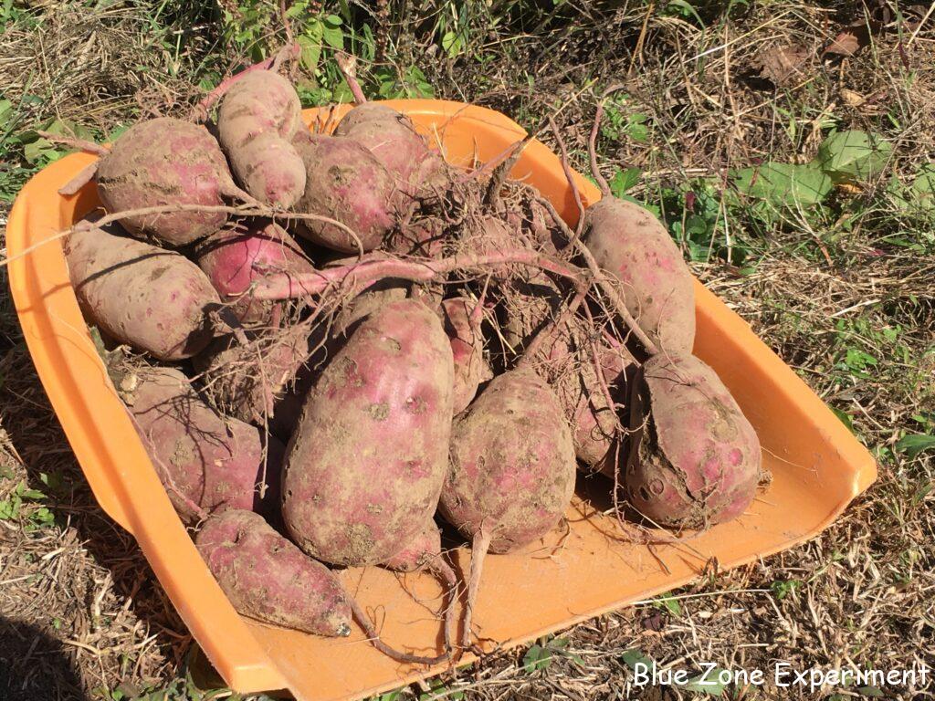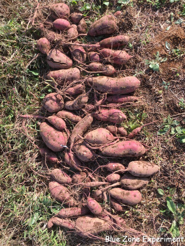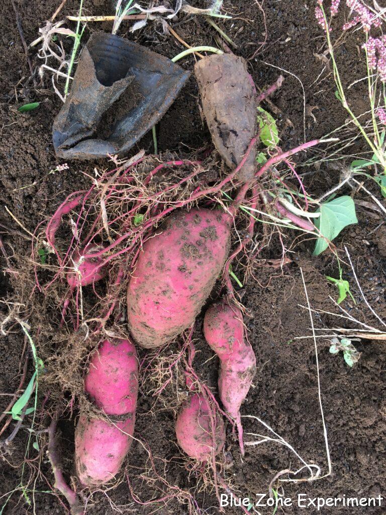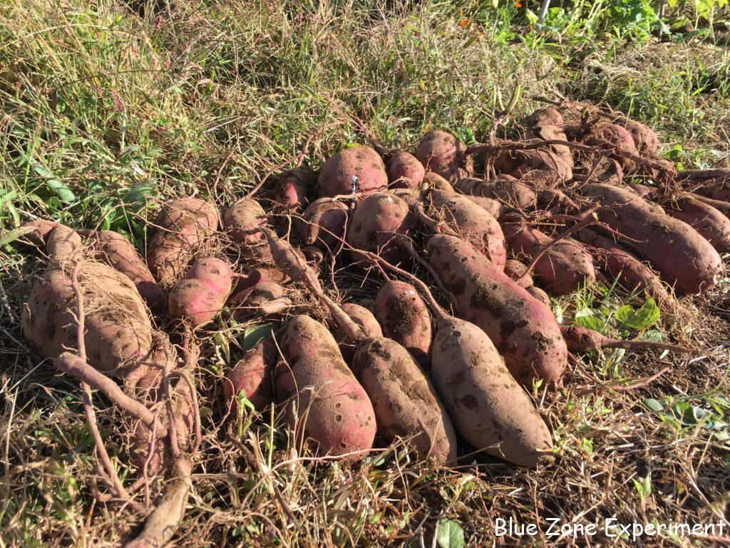 まず、一番端の株を掘ってみます。ズルズルと引きずり出してみると、形は不揃いながら、なかなかの重量感! 今年は行けるのでは、と期待させる滑り出しです。しかし、2 株目、3 株目と掘り進んでいくと、芋が小さかったり、数が少なかったり……。結果的には、去年よりはマシだったものの、収量は少なめ。