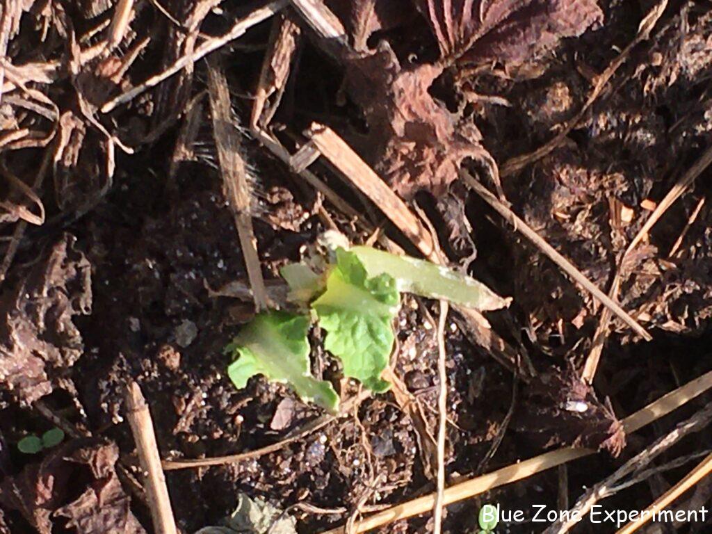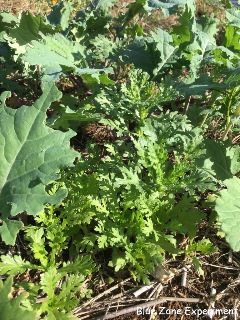 今畑で一番元気があるのはケールでしょうか。自家採種した種から育てましたが、発芽もよく、グングン育っています。間引き菜の他、外葉からの収穫も始めました。葉物野菜が不足していたのでありがたいです。同じ場所で、春菊も育ってきました。