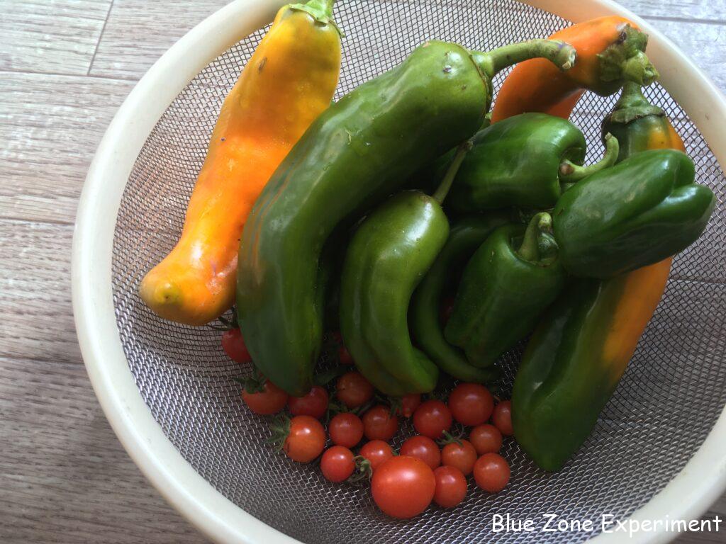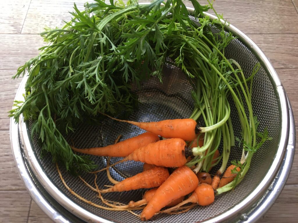 夏野菜は残りわずかです。パレルモは、たくさんなっていますが、なかなか色が変わりません。葉物が少しずつ育ってきたので、大根、日野菜カブ、ルッコラ、ビーツ、春菊など、間引き菜を食べることができます。キアゲハの幼虫に明け渡したニンジンは、あきらめていたのですが、最近復活してきているので間引いてみました。間引いたディルと自生のアップルミントも収穫。