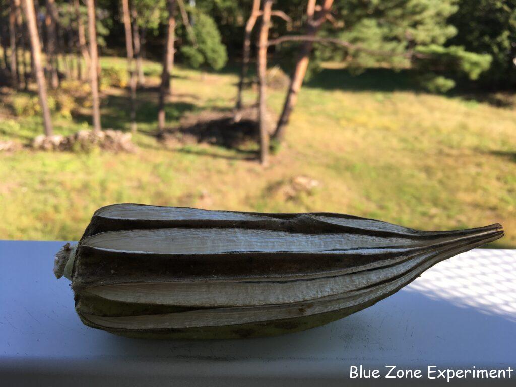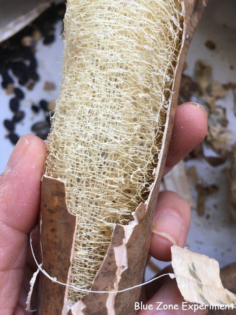 畑で乾燥させたヘチマの皮は、すでにパリパリです。それを手でむきます。中に入っている種は、ヘチマを振ると先端から落ちてきます。カビが出ているところがあるので、後日煮沸して干す予定です。