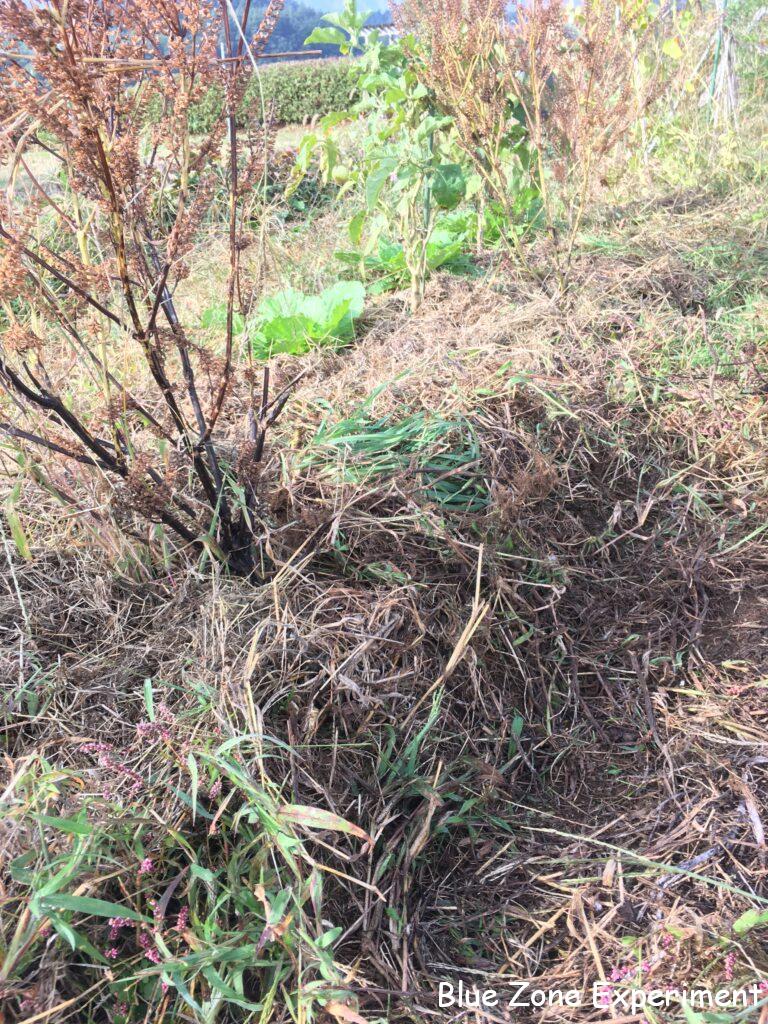 野菜を植えていない場所には、草をたっぷりかぶせて来シーズンに備えます。