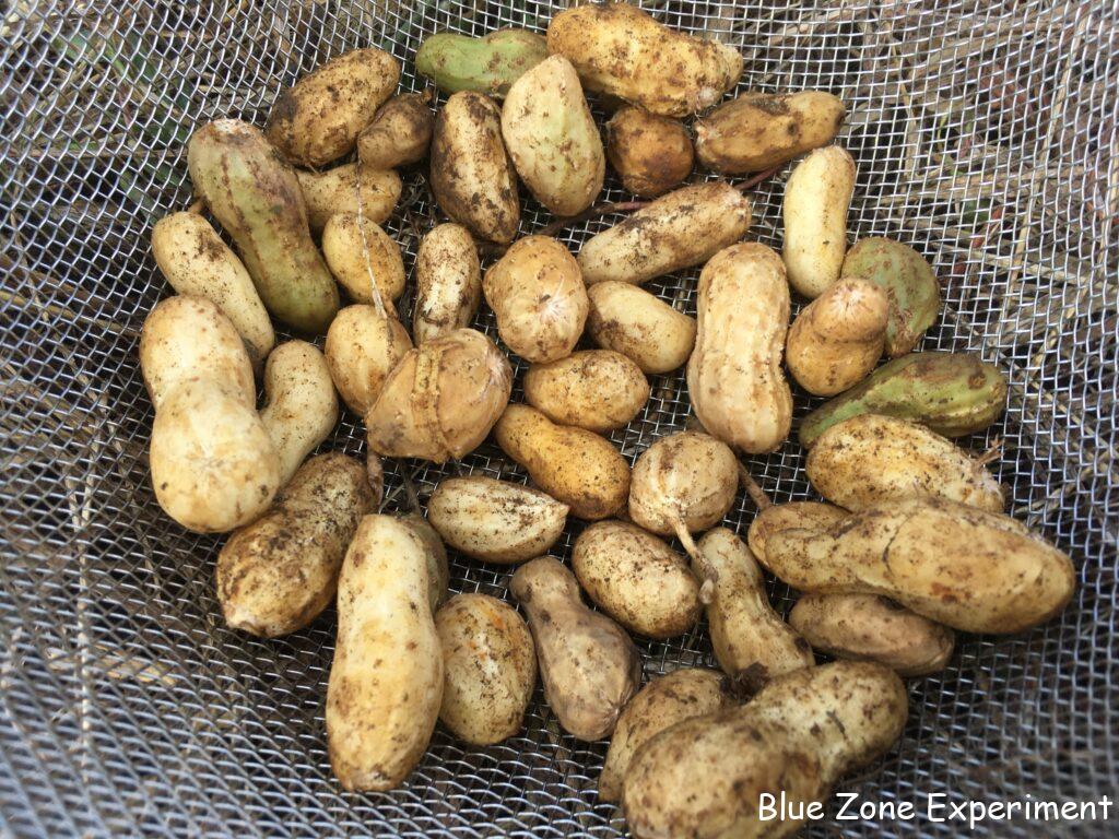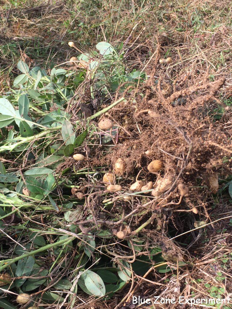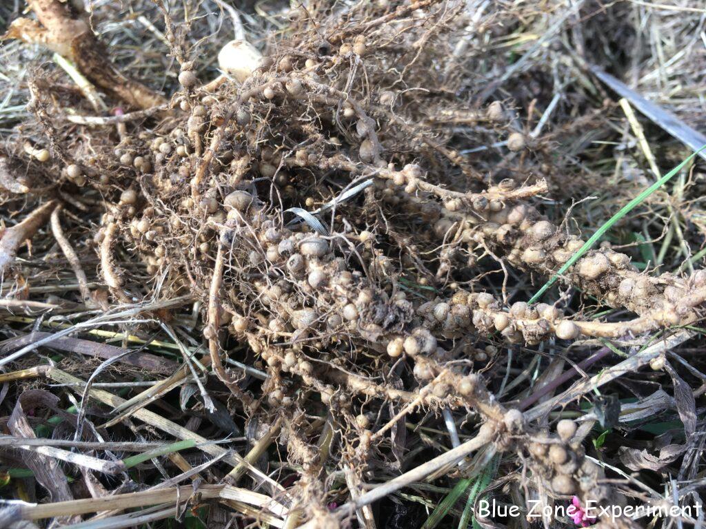 動物に掘られたのか、莢が地上にとび出していた落花生ですが、今日収穫します。株自体は結構大きくなってはいますが、まだ葉っぱが青々としています。掘ってみると、案の定、莢は成熟していないようです。どっちにしても霜が降りる前に掘るつもりだったので仕方ありません。小さすぎるものと虫食いのものを除くと、ほんのちょっとしか残りませんでした。落花生の根っこには、根粒菌がたくさんついていたので、根っこだけ切って土に埋め戻し、上には草と落花生の残渣をかけておきました。