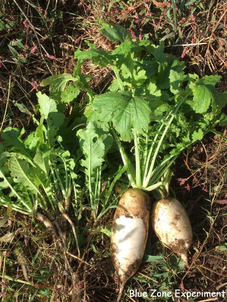 源助大根が太くなってきたので収穫しました。抜いてみるとずいぶん短い……。調べてみると、源助大根は太短いもののようです。ただし普通は 20~25 センチくらいあるとこのこと。計ってみると 10 センチと 15 センチだったので、まだ大きくなりますね。源助大根の特徴は、甘くて柔らかく、それでいて煮くずれしにくいので、おでんやフロフキ大根に向いているようです。葉っぱは、宮重大根の間引き菜と一緒に料理します。ニンジンもまた少し間引きました。春に種をまいたものが、今やっと成長してきました。夏に種をまいたものはほとんど発芽せず、発芽してもまだとても小さいです。最後の落花生は、ほんの少しでも収穫できてよかったです。あとは、ホーリーバジル、アップルミント、ミニトマト、パレルモ、万願寺トウガラシ、伏見甘長トウガラシ、ケール、チャード、ルッコラと春菊の間引き菜を収穫しました。ルッコラは大きくなると辛すぎるので、ベビーリーフがちょうどいいです。春菊も小さいうちは生で食べるとおいしいです。ケールも間引き菜の小さいものがあったので、ルッコラ、春菊、ケール、ミニトマトをサラダにしたら、とてもおいしかったです。