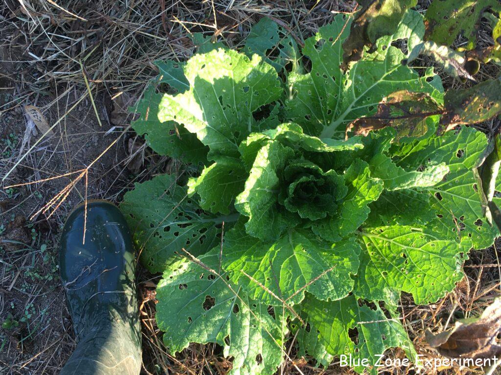 丸坊主になって復活し、その後また丸坊主にされた白菜は、驚きの生命力で再び復活しました。どこまで成長できるか楽しみです。他の白菜は、巻かないと思いますが、大きな株に成長してきました。比較のために足を横において撮影しました。外葉は虫食いだらけですが、新しい葉っぱはきれいです。