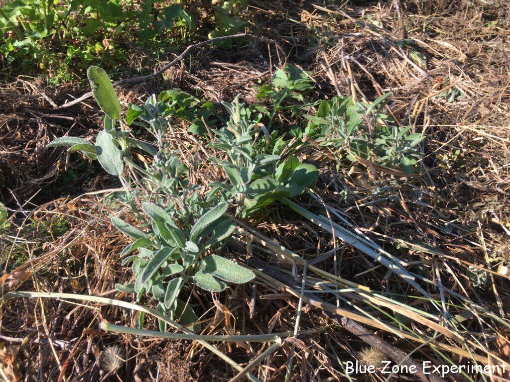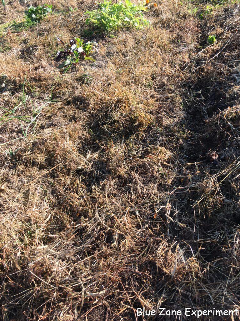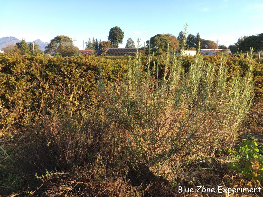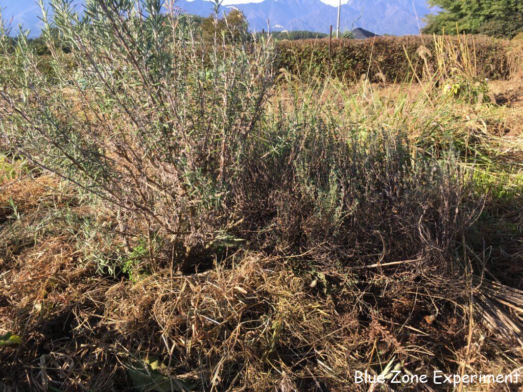 涼しくなって、ハーブ類は元気になってきました。でも、もうそろそろ霜の降りる季節。ローズマリーもタイムもラベンダーもすでにここの冬は体験済みで、枯れても春になれば復活するとわかっていますが、霜柱で持ち上げられると傷んでしまうとのこと。今日は、稲わらで株元を覆い、さらに草もどっさりのせました。セージもこの辺りの気候で越冬できると聞いたので、おなじように根元を藁と草で覆いました。