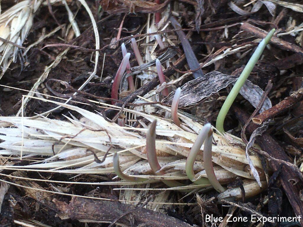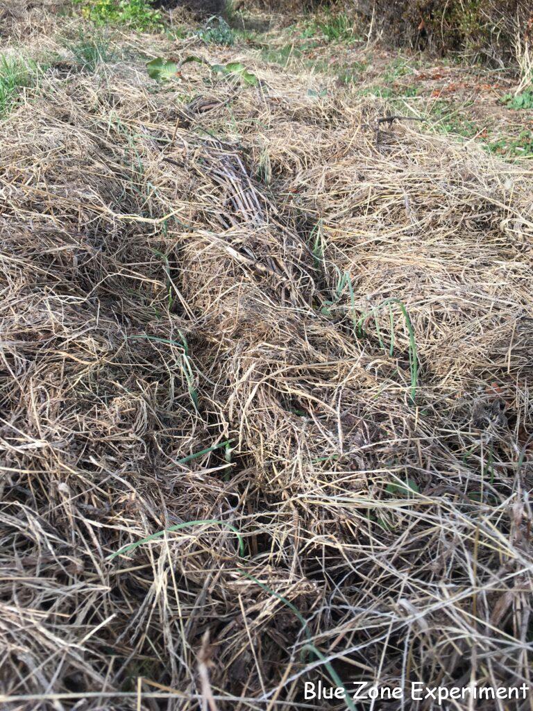 穂のままばらまいたライ麦も発芽していました! 草の上に乗ったりして土に接していないものは発芽していませんが、うまく土に接触している一部の穂は、そのまま発芽していました。穂からたくさん芽が出ているのは、なんだか不思議な光景です。