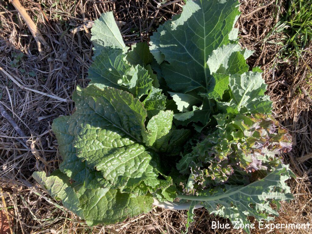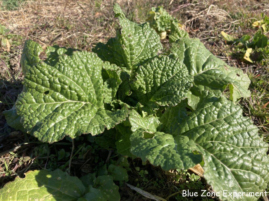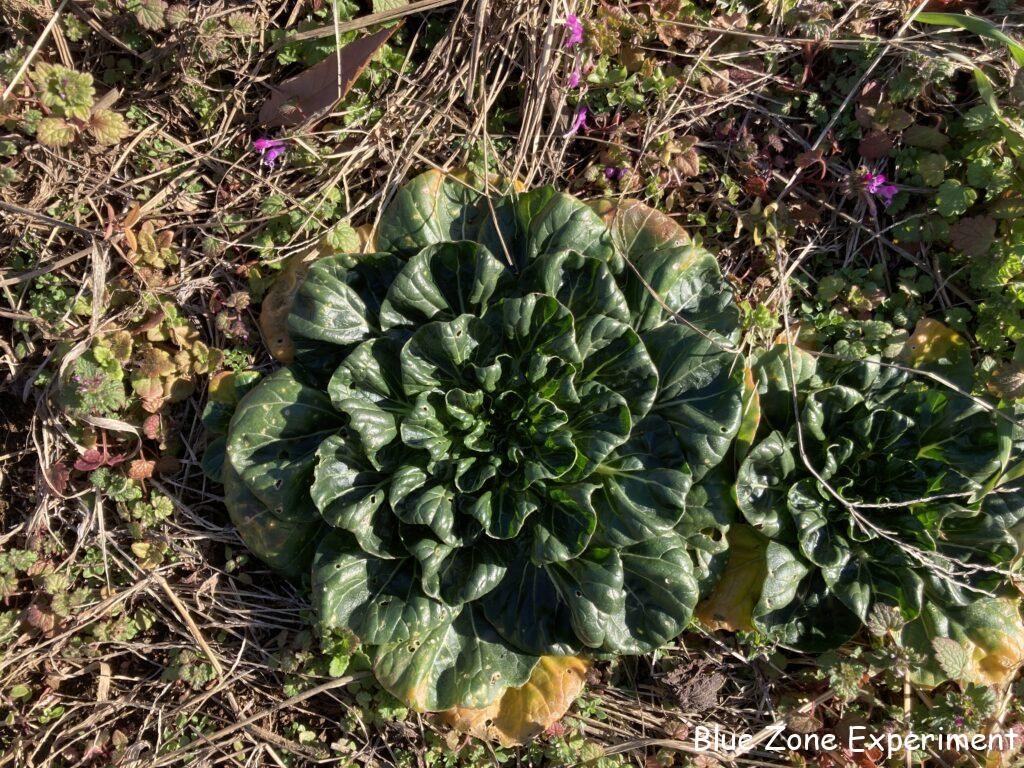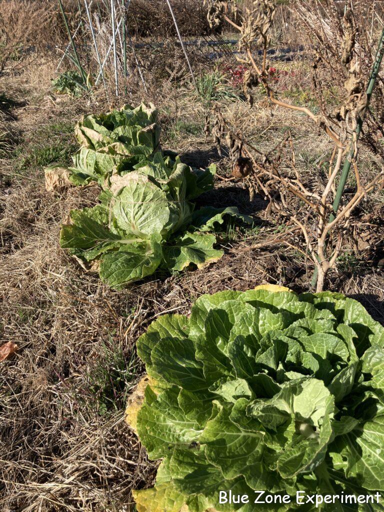 約一週間前に霜の直撃を防ぐために紐で縛った白菜は、巻いてはいないものの、中央部は成長しているようでした。大きさだけは一人前です。紐で縛らなかったものも大きく広がっています。外側の葉っぱから収穫して、春には菜の花を楽しもうと思います。