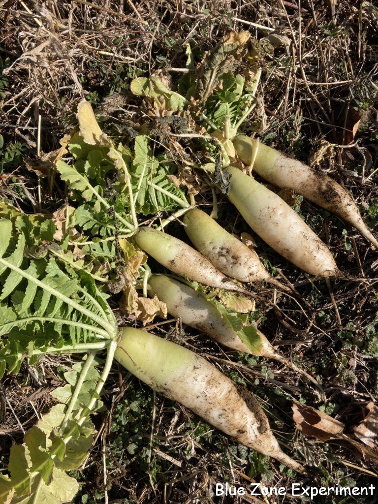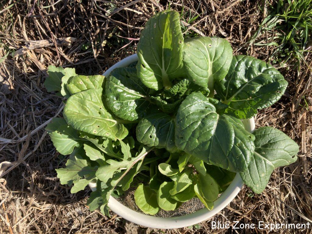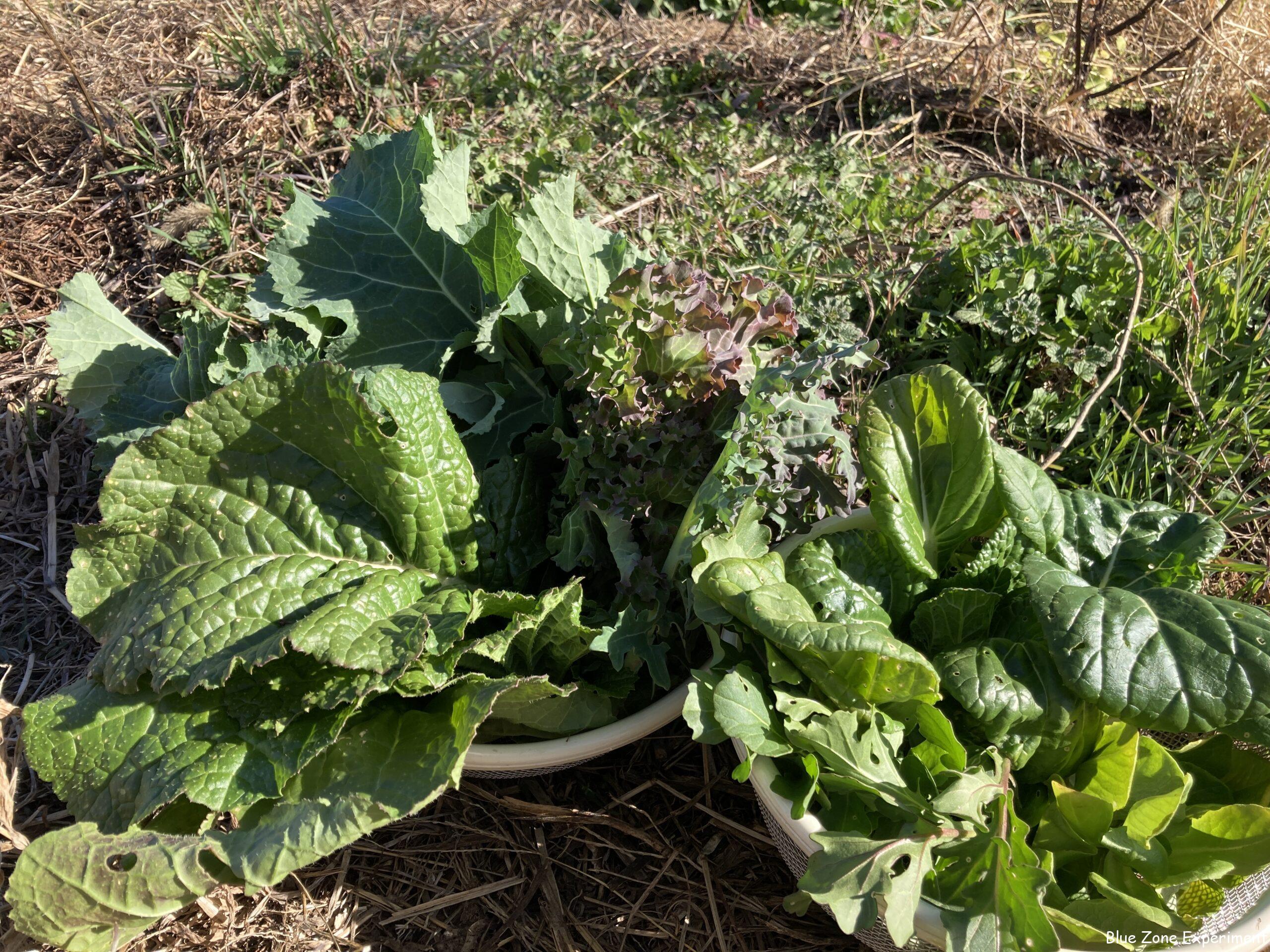今日の収獲は、ビタミン菜、サラダ菜、ルッコラ、カラシナ、カツオナ、ケール、大根です。ほとんどがアブラナ科の野菜。一人分としては十分な量が収穫できました。寒い中、収穫できるものがあるのは本当にありがたいです。