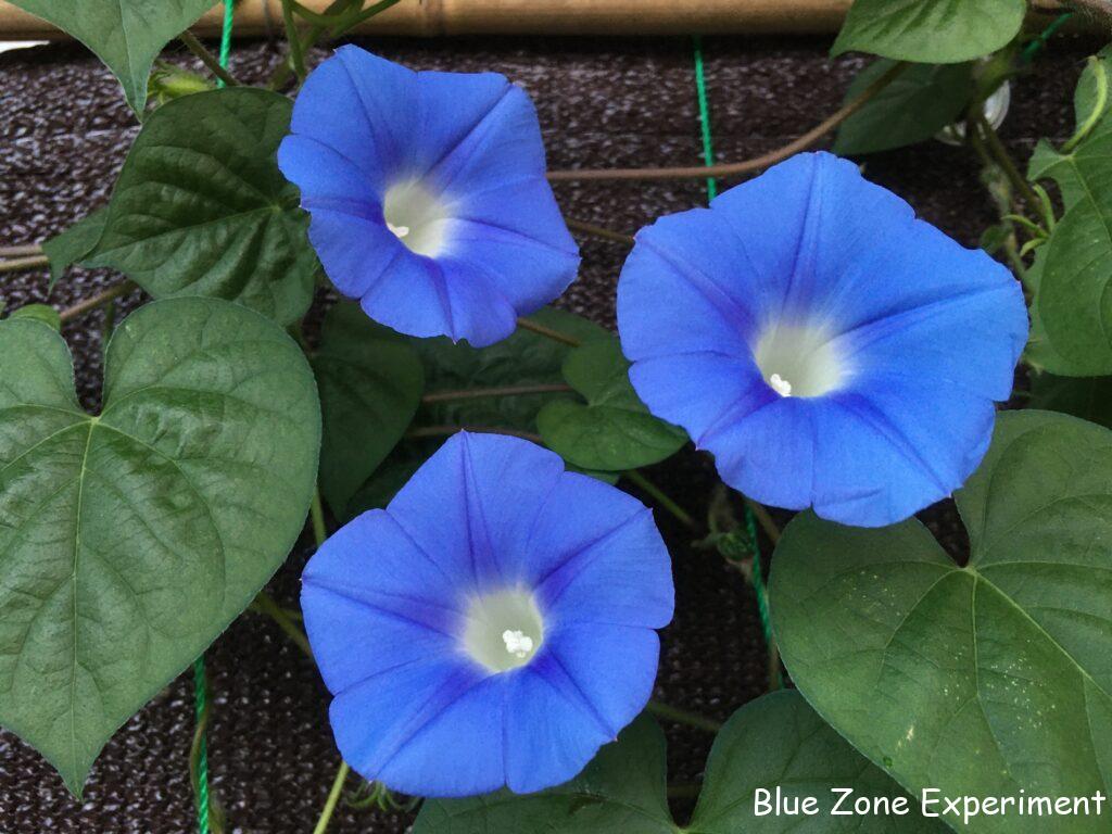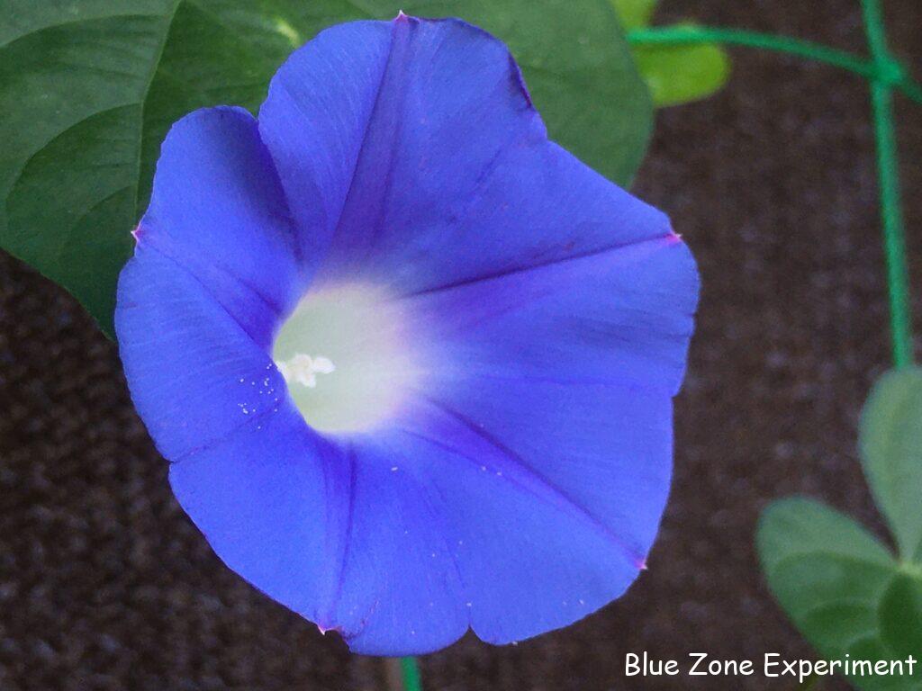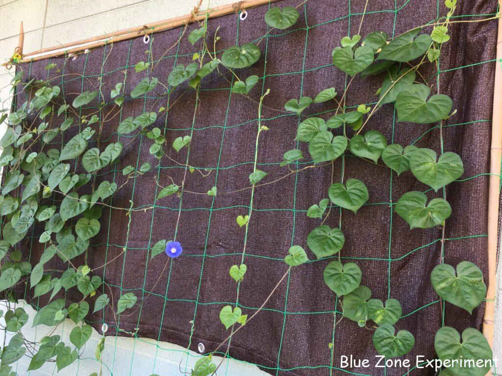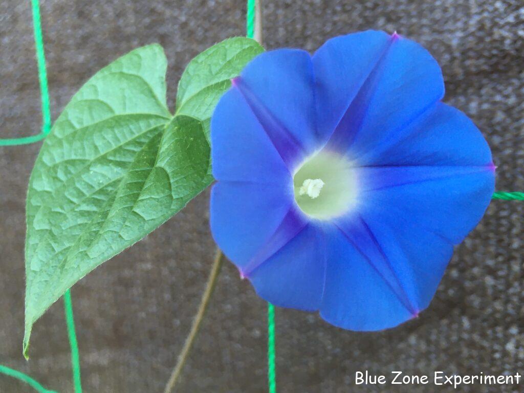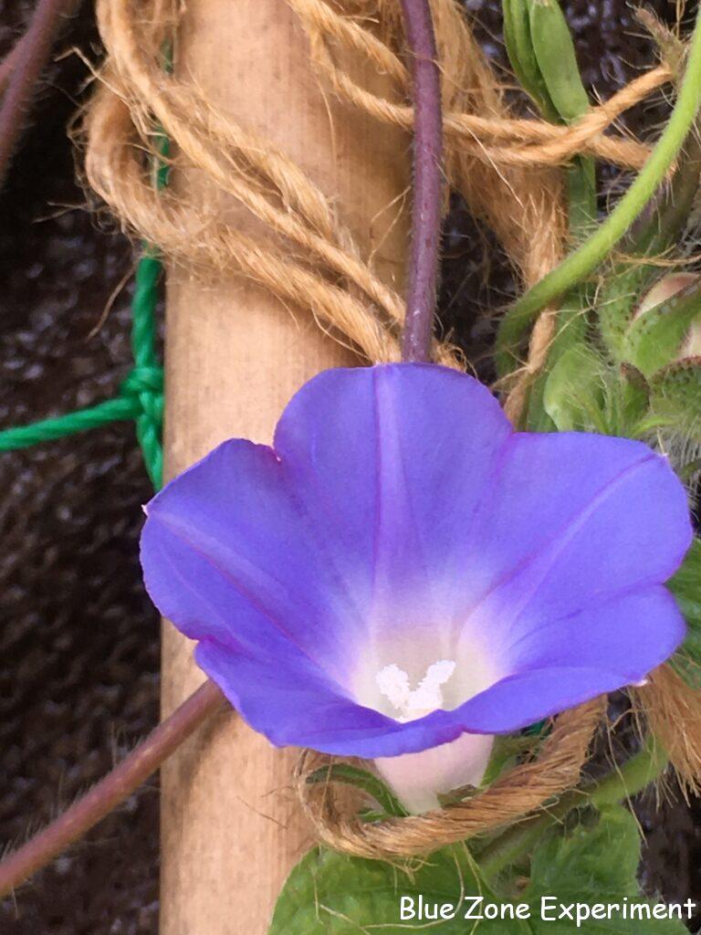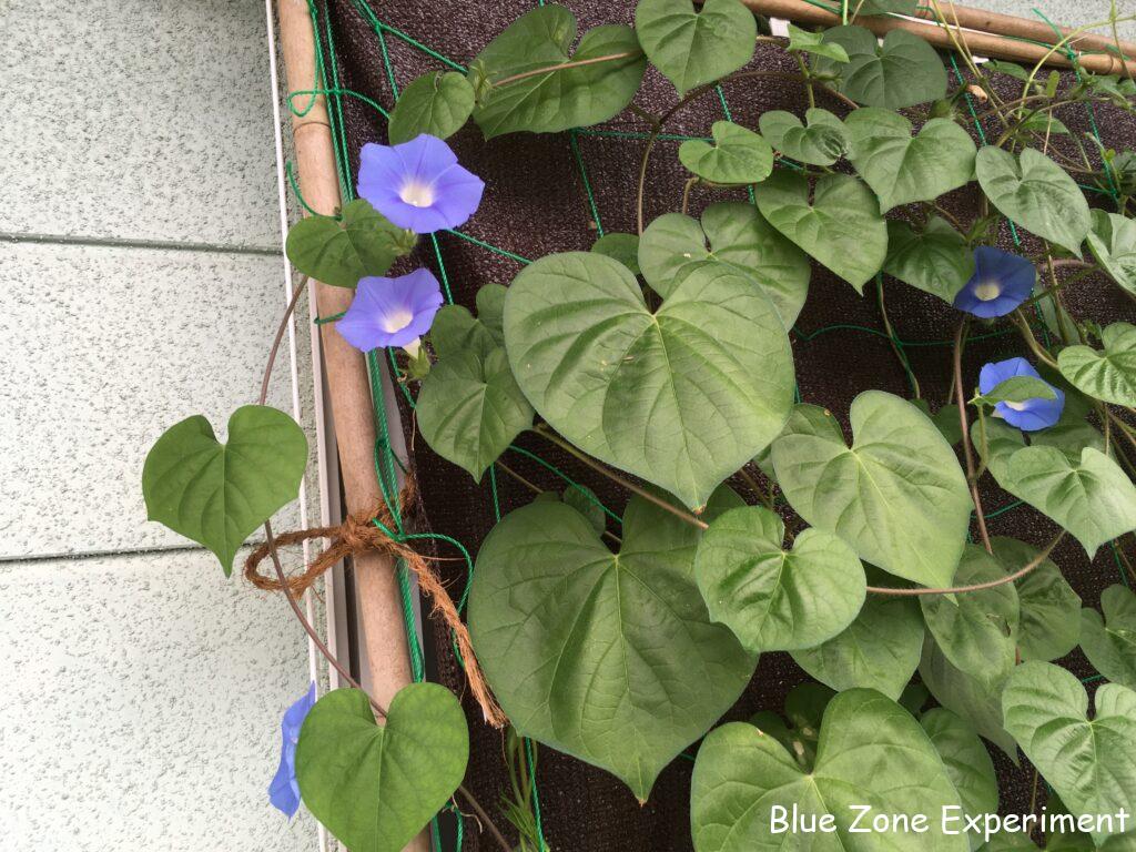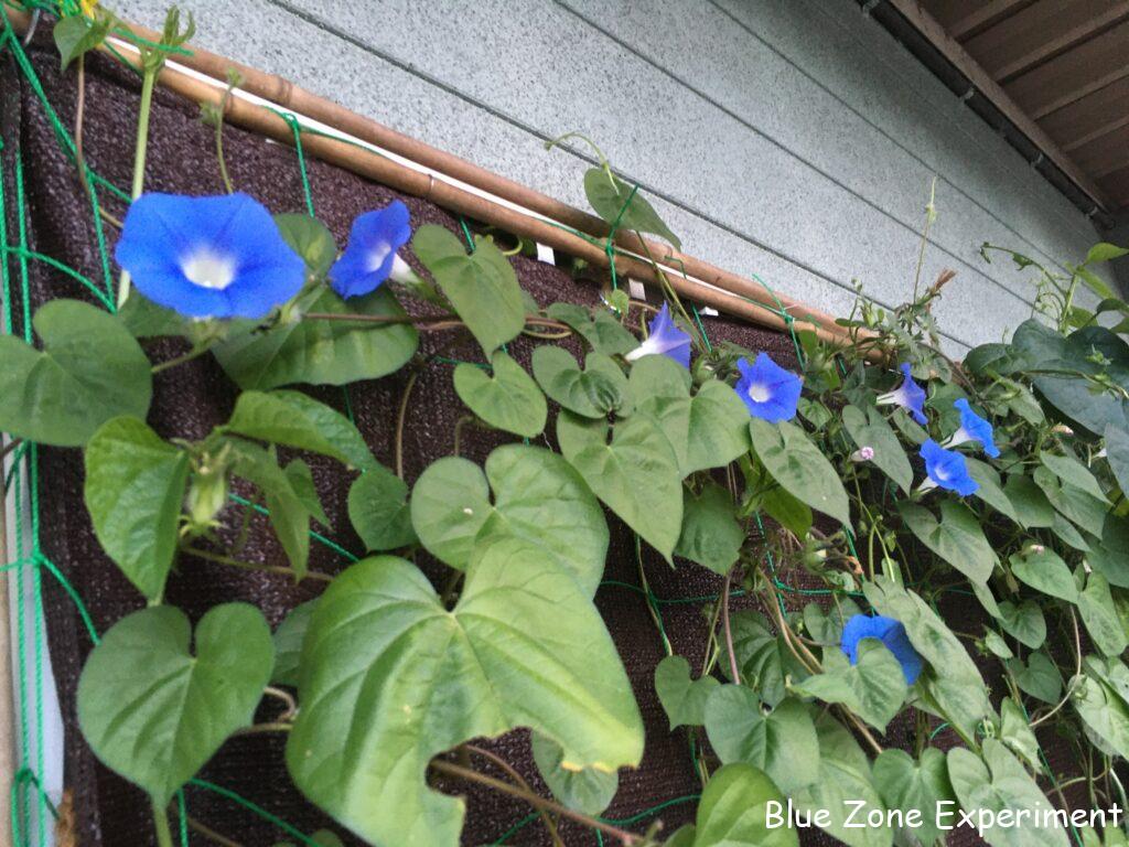8 月終わりに帰宅してからは、なんとか生き返ってほしいと願いながら、毎日、朝晩水をやり続けました。その気持ちに、植物はちゃんと応えてくれました! 9 月 1 日、朝顔がはじめて開花。小さな花ですが、とても神秘的な青です。葉っぱも少しずつ窓を覆ってきてくれました。