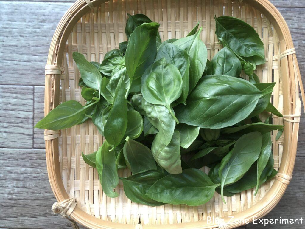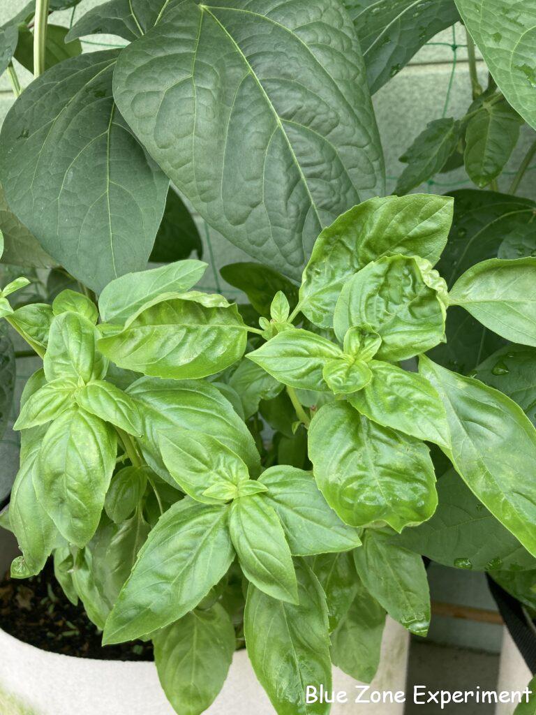 お盆の頃、朝顔はひょろひょろと伸び、ササゲやミニトマトも少しずつ成長しています。暑さと乾燥に負けず、葉っぱも緑でたいしたものです。バジルの収獲もできました。ミニトマトも一個だけ。