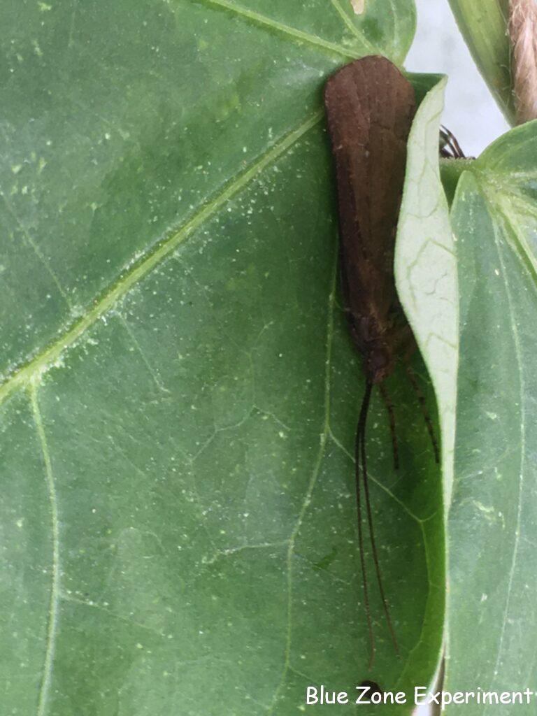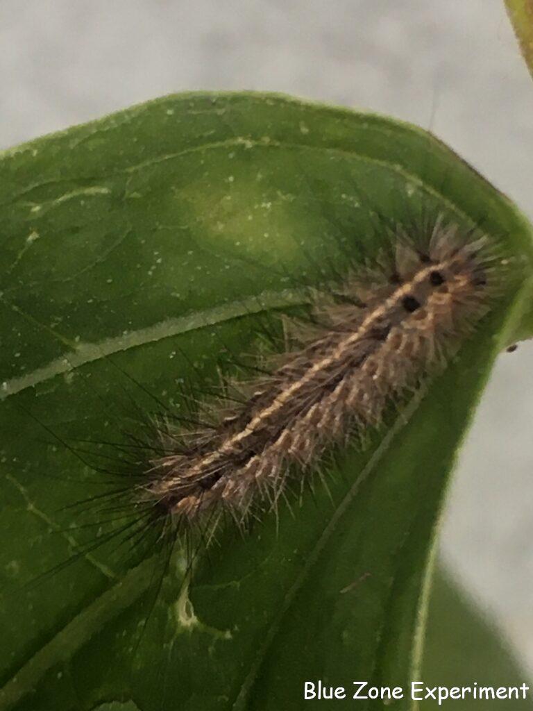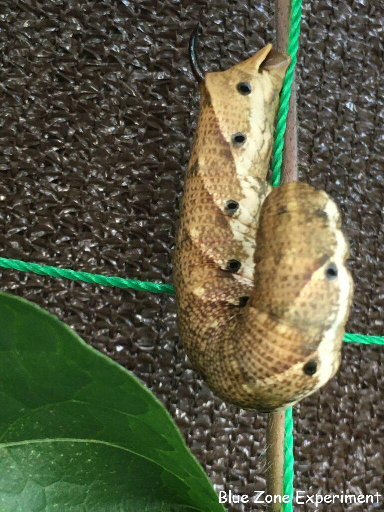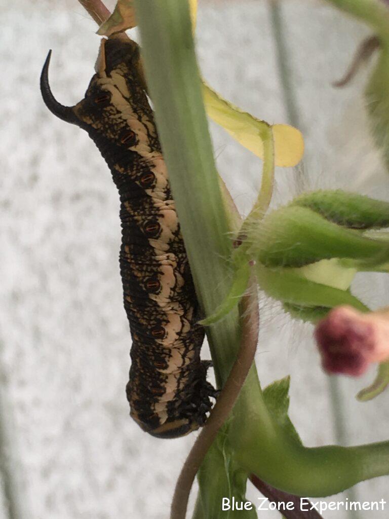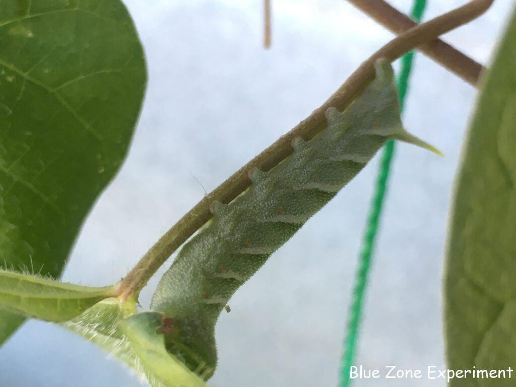 10 月 14 日、黄色くなった葉っぱやしおれた葉っぱを取り除いているときに、虫を何匹か発見しました。エビガラスズメの幼虫は、これまで見たものよりかなり小さいです。朝顔の葉っぱがほとんど残っていないからか、どちらもササゲにくっついていました。調べてみると、エビガラスズメの幼虫は、ササゲも食べるようです。でも、朝顔の全盛期には朝顔ばかり食べていたので、朝顔の方が断然好きなのでしょうね。今回の経験で、朝顔をコンパニオンプランツにすると、ササゲが守られるということがわかりました。あとは何らかの毛虫と蛾のような虫。隠れるところが少なくなると目立ちます。