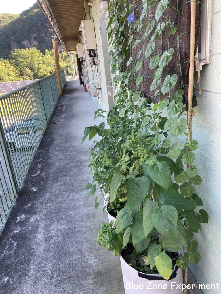 いつの間にかこぼれ種から芽を出したピーマンも成長し、花を咲かせました。ミニトマトの花も咲き、小さな実もをつけはじめました。毎朝可憐な姿を見せてくれる朝顔は、さっそく種をつけています。バジルはとても順調で、何度も収穫しています。家の中から窓の外を見ると、葉っぱが涼しげです。