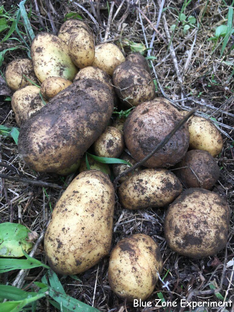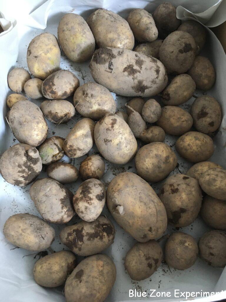 今年はイノシシ被害が多発しています。ジャガイモの畝は、二回イノシシに入られ、多くが掘り返されてしまいました。全滅する前にと、まだ早いと思われるものも収穫してしまいました。写真は、一回目に入られたときに収穫した分ですが、二回目にも同じくらい収獲したので、全部でこの倍は収穫できました。