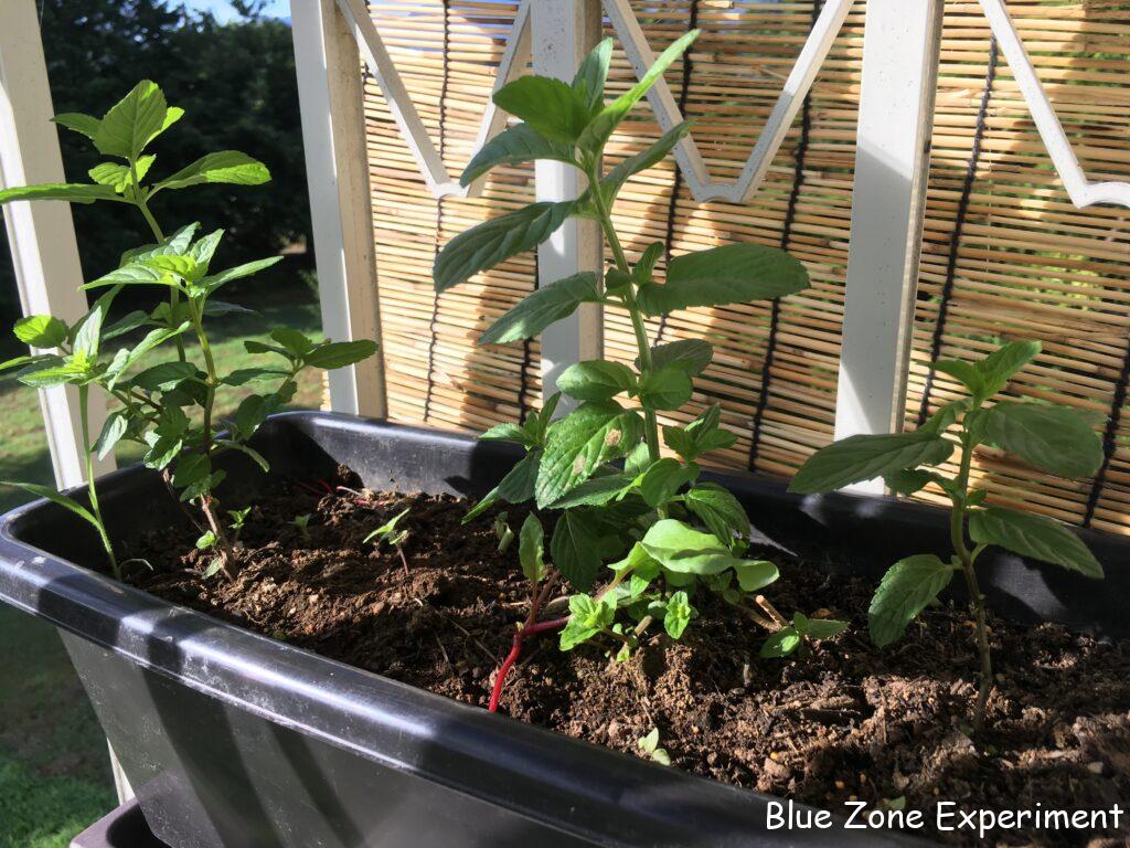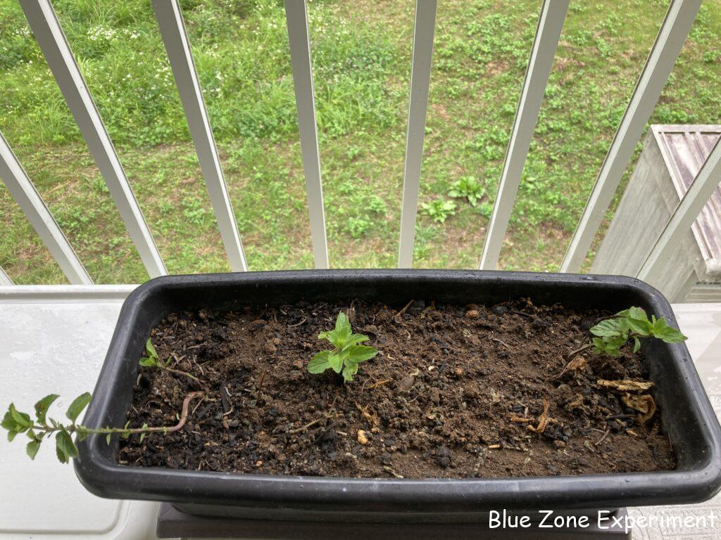 春にイエルバブエナという品種のミントを分けていただいたので、畑に植えました。ミントは増えすぎるので、素焼きの鉢に植えたものを土に植えて、増殖を防いでいます。その鉢が小さいからか成長がもう一つだったので、今月初めに一部引き抜いて持ち帰り、空いていたプランターに植えてみました。ほぼ一か月経って、立派に成長しています。暑すぎるこの時期、半日陰に置いているのもいいのかもしれません。