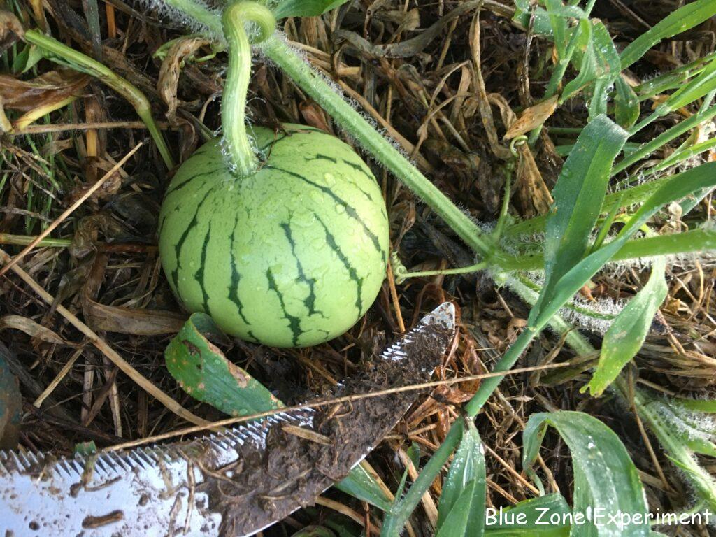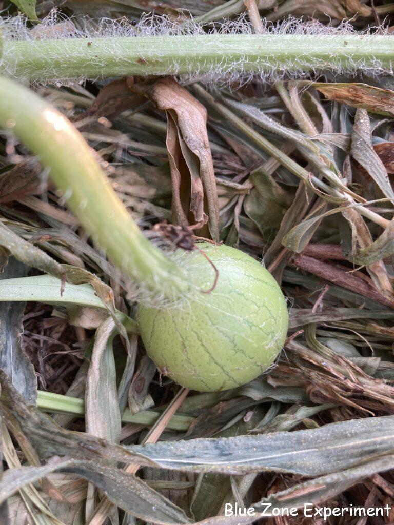 スイカもウリ科なので、ウリハムシの被害を受けました。その前には、遅霜でやられてしまった株もあり、遅い時期に種をまきなおしました。7 月末にまだまだ小さい状態ですが、小玉スイカなので何とかなると思います。今日見たスイカは、3 日前と比べてずいぶん成長していました。一つでもちゃんと実りますように。