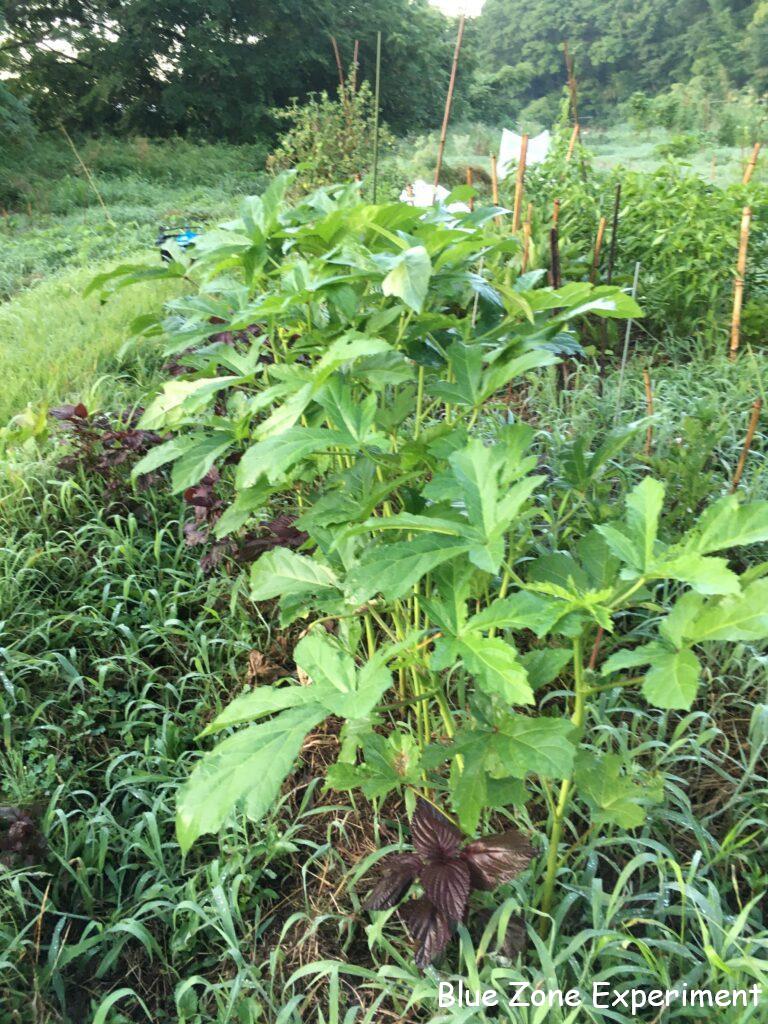 今年はじめて挑戦するサトイモは、なかなか芽が出なかったので少し成長が遅れていますが、それでも元気に育っています。写真ではわかりませんが、サトイモの陰になるように、株間にショウガも植えていて、最近芽が出てきました。赤ジソは勝手に生えてきています。ミニトマトは、遅霜被害で植え直しましたが、順調に育っています。ズッキーニは、株自体は大きくなっているのですが、実が大きくなりません。遅霜にやられた上に、今年はウリハムシが異常に多く、長い間あんどんをかぶせていて、日照不足になっていたのが原因なのかもしれません。一株以外は、小さいままで、収穫はあまり期待できそうにありません。オクラは、去年自家採種したダビデの星です。去年はほったらかしにしていてほとんど収穫できませんでしたが、今年はちゃんと育っていて、今日二回目の収獲をしました。