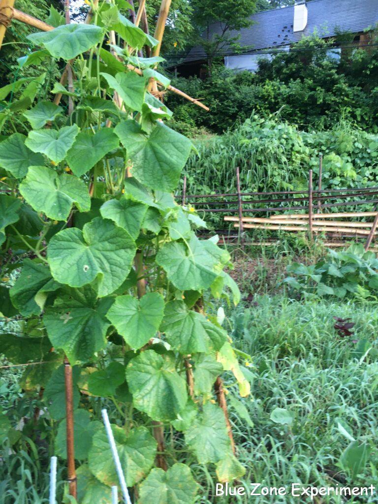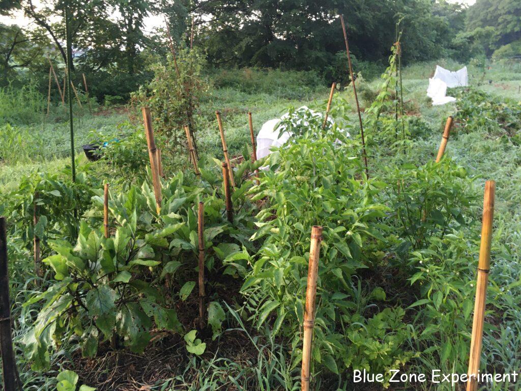 キュウリは、ウリハムシの被害を避けるためにあんどんで長い間囲っていましたが、幸い成長して支柱の頂点に達しています。先日初収穫も果たしました。今日はなっているかどうか見るのをすっかり忘れていました。トウガラシ類は、伏見甘長トウガラシ、万願寺トウガラシ、パレルモ、ピーマン、オレンジミニパプリカと、すべて去年自家採種したものです。ほぼ順調に育っていて、たくさん収穫できています。それに反して、ナスはあまりよくありません。広い畝の東西にトウガラシ類、中央にナスを植えたのですが、トウガラシ類の方が生長が早く、ナスの日当たりを悪くしてしまっています。ナスはまともに育てられたことがないので、今年こそと思っていましたが、今のところは残念ながらうまくいっていません。これから盛り返すことを期待しています。