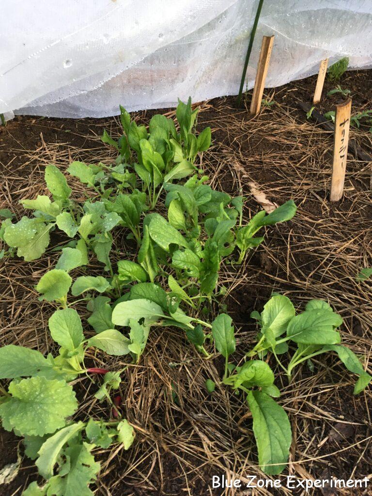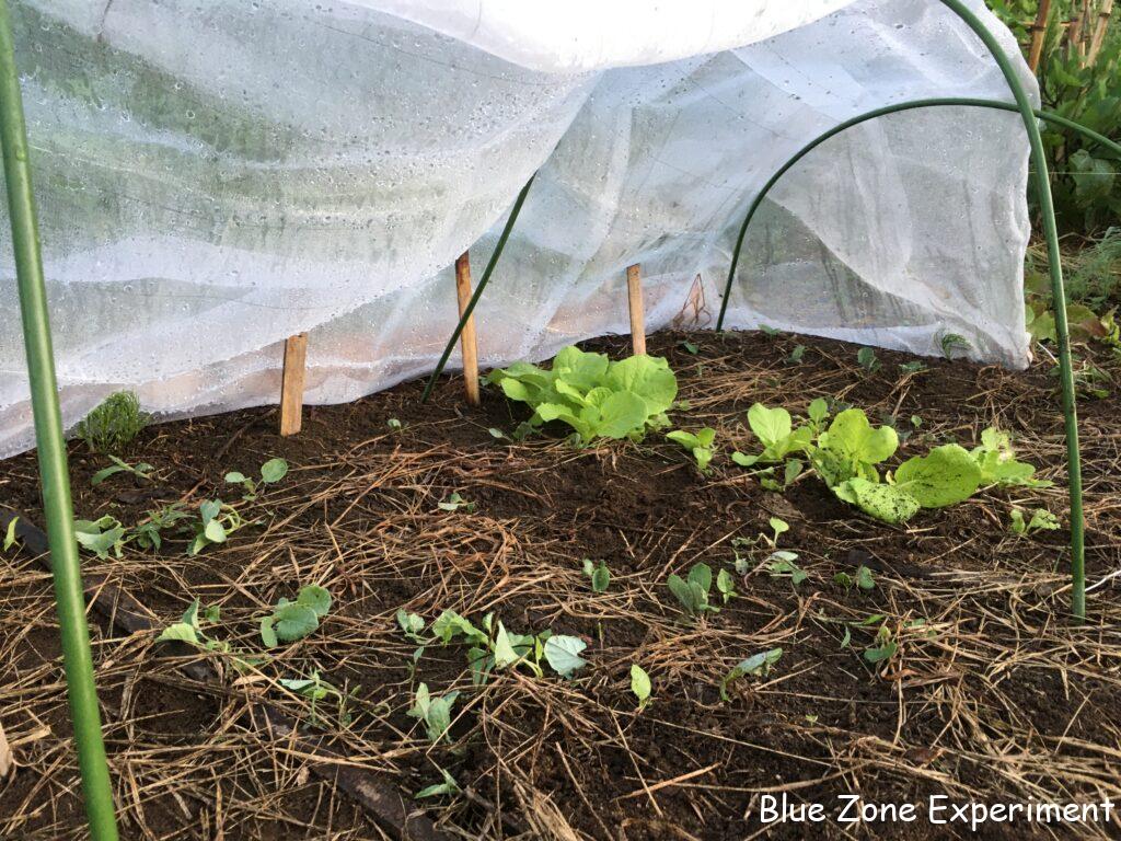 今年ははじめて防虫ネットを購入しました。アブラナ科冬野菜の育苗のためです。毎年アブラナ科は、ダイコンサルハムシの被害がひどく、虫を育てているような状況だったので、意地を張らずに防虫ネットに頼ることにしました。ネットの下には、芽キャベツ、カリフラワー、ブロッコリー、白菜、ビタミン菜、ラディッシュ。ラディッシュに関しては育苗して移植するわけではないのですが、ネットの外に種をまいたものは、虫に食われてあっという間に全滅したので、ネットの下にも種をまいてみました。7 月 10 日に種をまきましたが、少し早すぎたかもしれません。白菜はもう移植するような大きさになってきましたが、連日 35 ℃前後の暑い日が続いているので、暑すぎて駄目になってしまいそうです。今日、イチかバチか、ナスの陰にいくつか移植してみましたが、どうなることでしょうか。