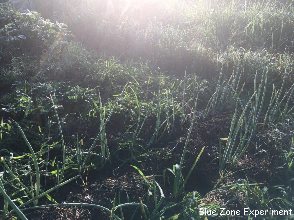 朝日がまぶしくてよく見えないまま撮影したのでよくわからない写真ですが、前の畑から移植したイチゴのコーナーです。今年はほとんど収穫できませんでしたが、ちゃんと根付いたので、これから広がっていくと期待しています。ただ、この畝はチガヤと笹がはびこっていて、イチゴの間からどんどん生えてきて困っています。