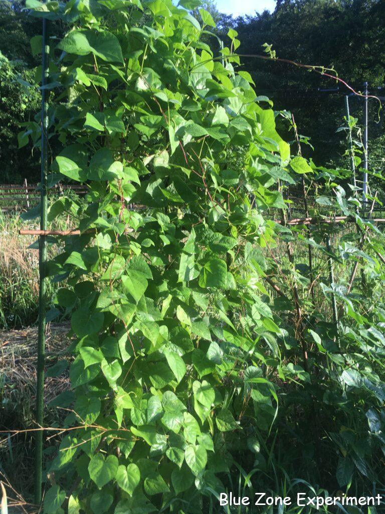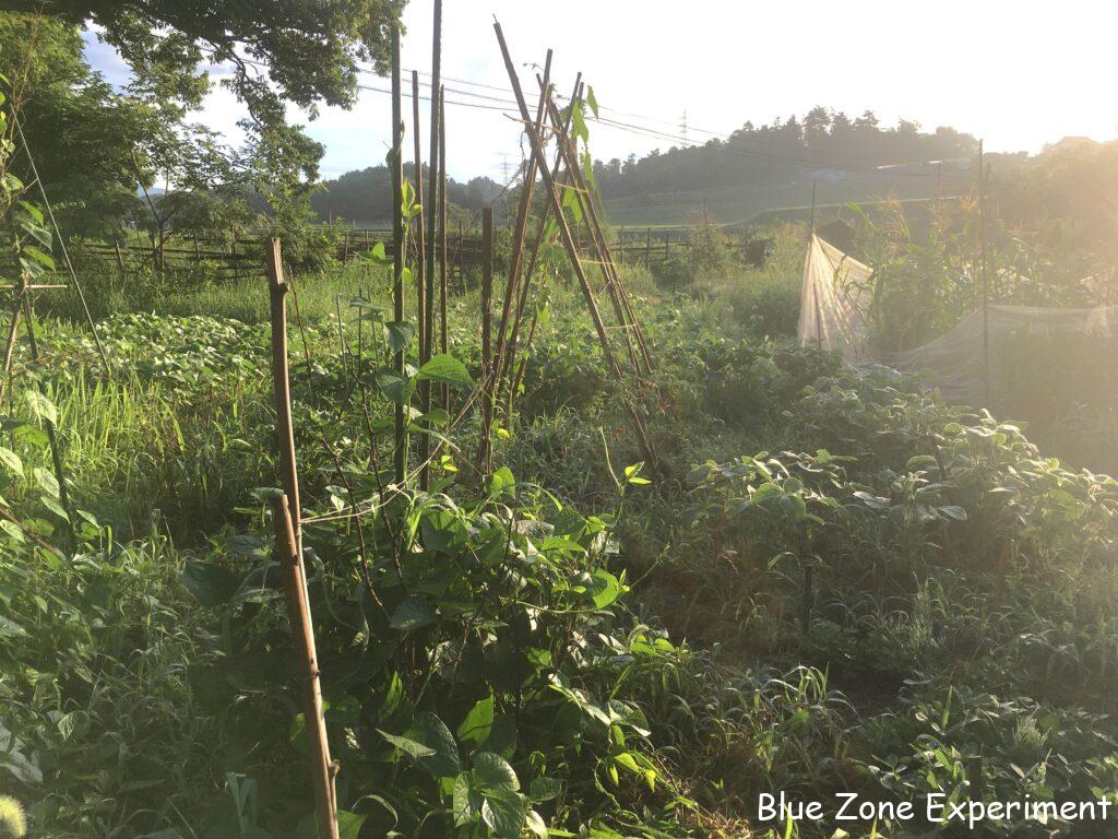 夏の豆類は、ササゲ、黒インゲン、白インゲンです。ササゲと白インゲンは、去年自家採種したもの。黒インゲンは、分けていただいた自然農で育った種です。どれもまずまずと言ったところですが、支柱の強度に不安があるので、台風が来たらやられてしまいそうです。ササゲの奥に見える支柱の根元にはトマトが植えてあるのですが、何らかの病気にかかってしまったらしく、どの株も瀕死の状態です。ミニトマトは他の場所にも植えているのでいいのですが、ここには今年はじめて作る品種の中玉トマトがあって、それを一番楽しみにしていたので残念です。今年はゴールデンウィークが明けてから遅霜があり、すでに定植していたトマトやズッキーニ、カボチャ、スイカ、それにジャガイモなど、たくさんの作物が被害を受けました。そのため、トマトも二度目の定植で、今度こそと期待していましたが……。来年こそはうまくいくはずです。ササゲとトマトの右側には、写真では非常にわかりにくいですが、大豆が植わっています。大豆は、写真はありませんが、違う畝で別の品種のものも育てています。去年は、カメムシ大量発生で大豆が全滅しましたが、今年はどうでしょうか。