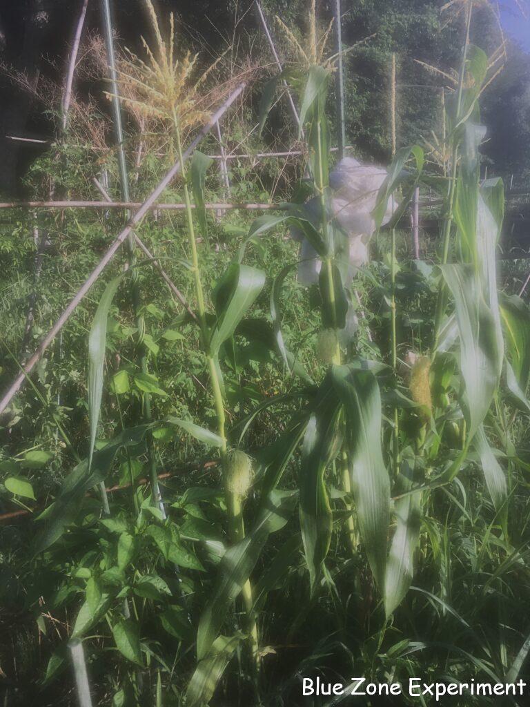 ヤーコンの種芋をいただいて、春に植えたものが、たくましく成長しています。去年なんとか自家採種できたトウモロコシ(もちっとコーン)も少しですが実をつけています(写真が悪くて見にくいですが)。
