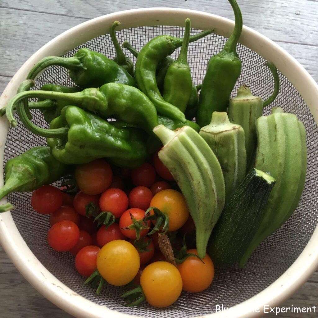 今日の収獲は、トウガラシ類、ミニトマト(今年は黄色もあります)、オクラ(ダビデの星)、すごく小さいズッキーニ、ニラ、スイートバジル、ホーリーバジル、イタリアンパセリです。
