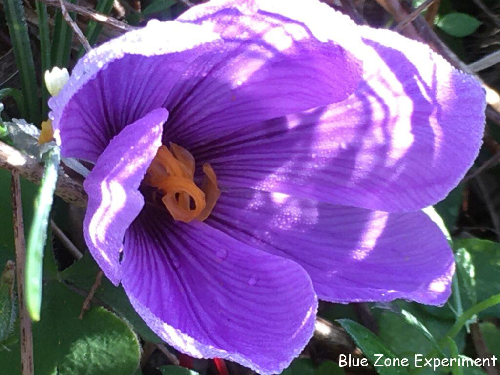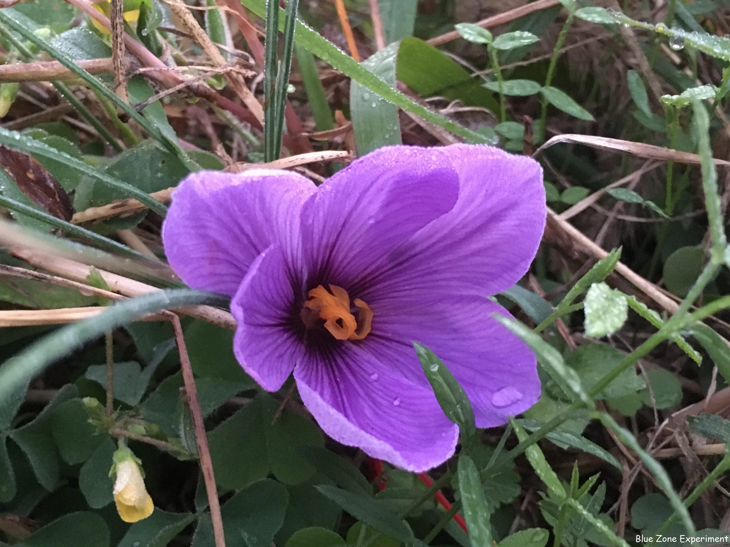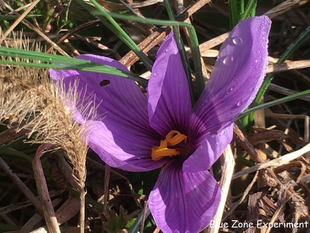2~3 日前に「そういえばサフランの開花はいつ頃だったかな?」と思って調べてみると、ちょうど今頃とのこと。今日見てみると、三つ花が咲いていました。貸農園から球根を移植したのですが、無事咲いてよかったです。もともとは、この自然農の畑で育った球根をいただいて貸農園に植えたものなので、故郷に帰ってきて花を咲かせたことになります。