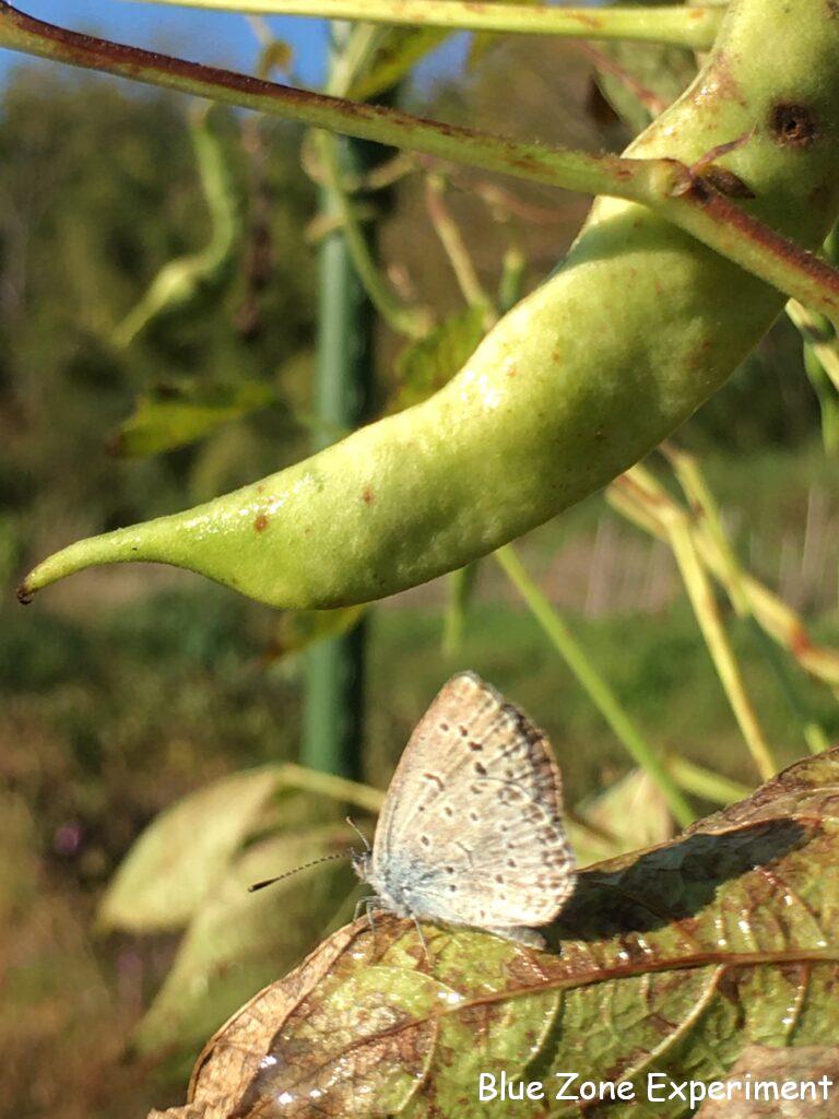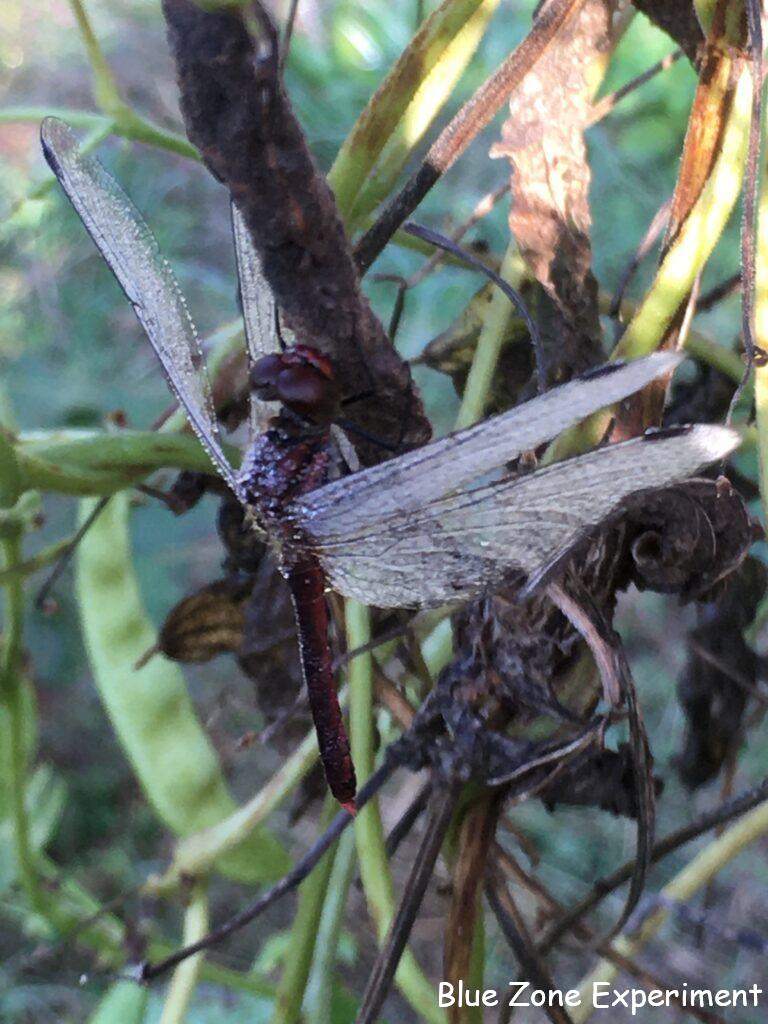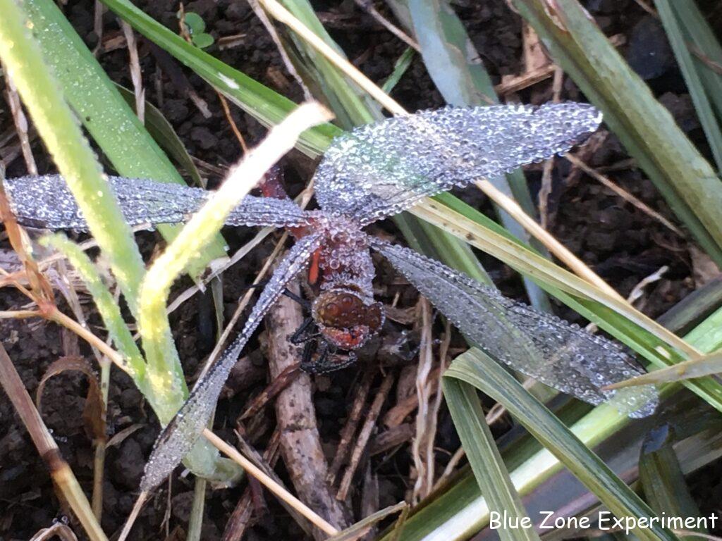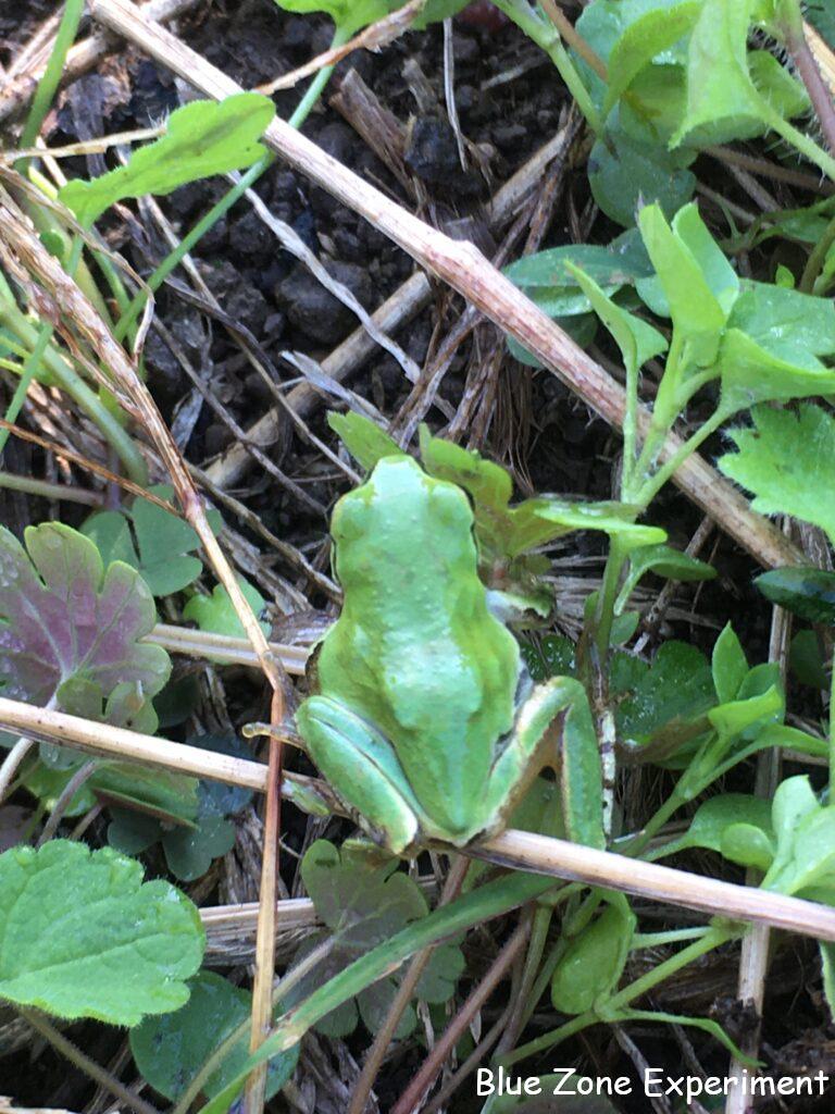 日の出前に畑に着くと、トンボや蝶が寒さで動けずじっとしていました。朝露をつけて、とても寒そうでしたが、日が出てあたたかくなってくると、乾いた翅で元気に飛び回っていました。先日土に潜ったトノサマガエルを見ましたが、今日はアマガエルが動き回っていました。11 月半ばでも 20 ℃を超える日がありそうなので、まだ冬眠には早いのかもしれませんね。