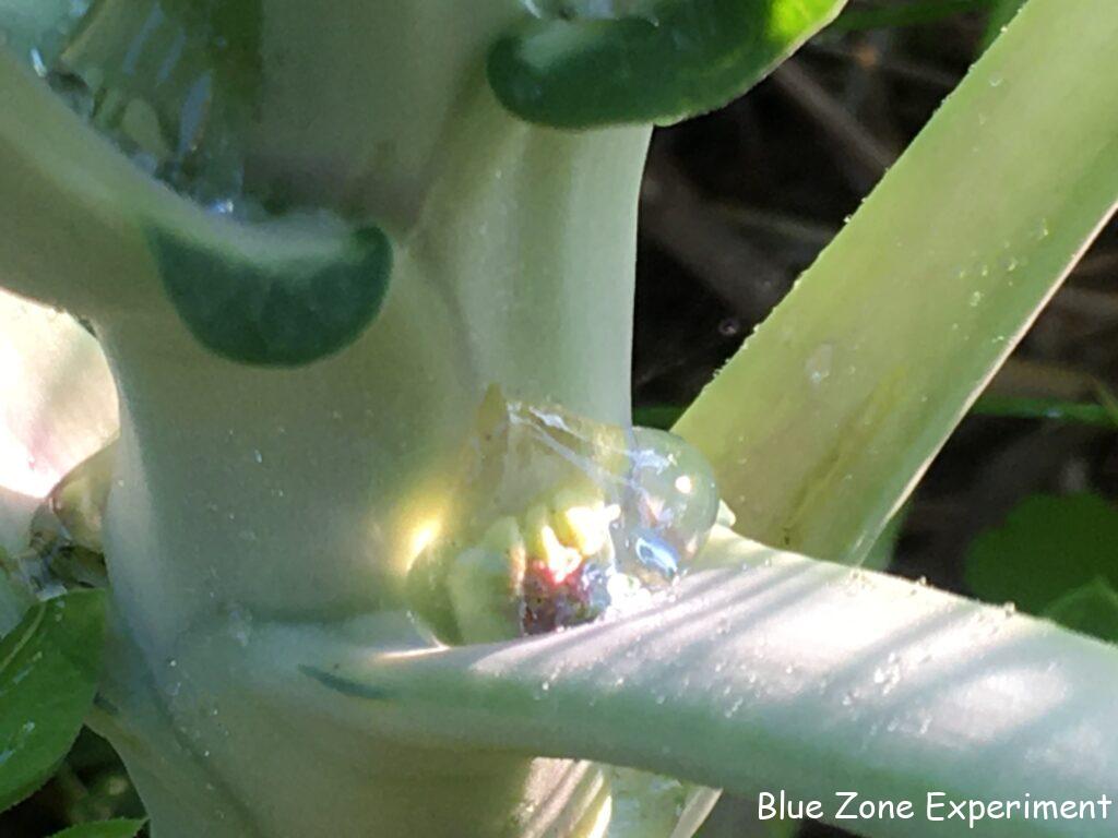 芽キャベツは、種をまくのが遅かったのですが、やっと小さな芽が付きはじめました。ちょうど芽が出てきているところに朝露がたまって、何とも言えない美しさでした。