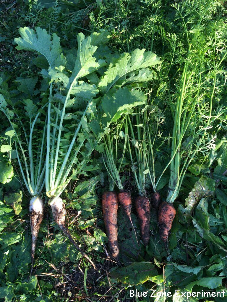 今日の収穫物は、金カブ、ラディッシュ、間引き大根、ニンジン、ミニトマト、ホーリーバジル、イタリアンパセリ、パレルモ、ピーマンです。大根、カブ、ニンジンの葉っぱだけでもかなりの量です。夏の間ほとんど食べられなかった葉物野菜をたくさんいただきたいと思います。