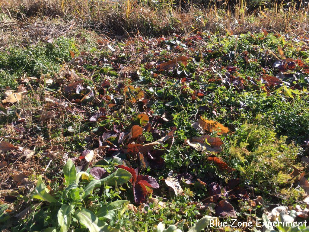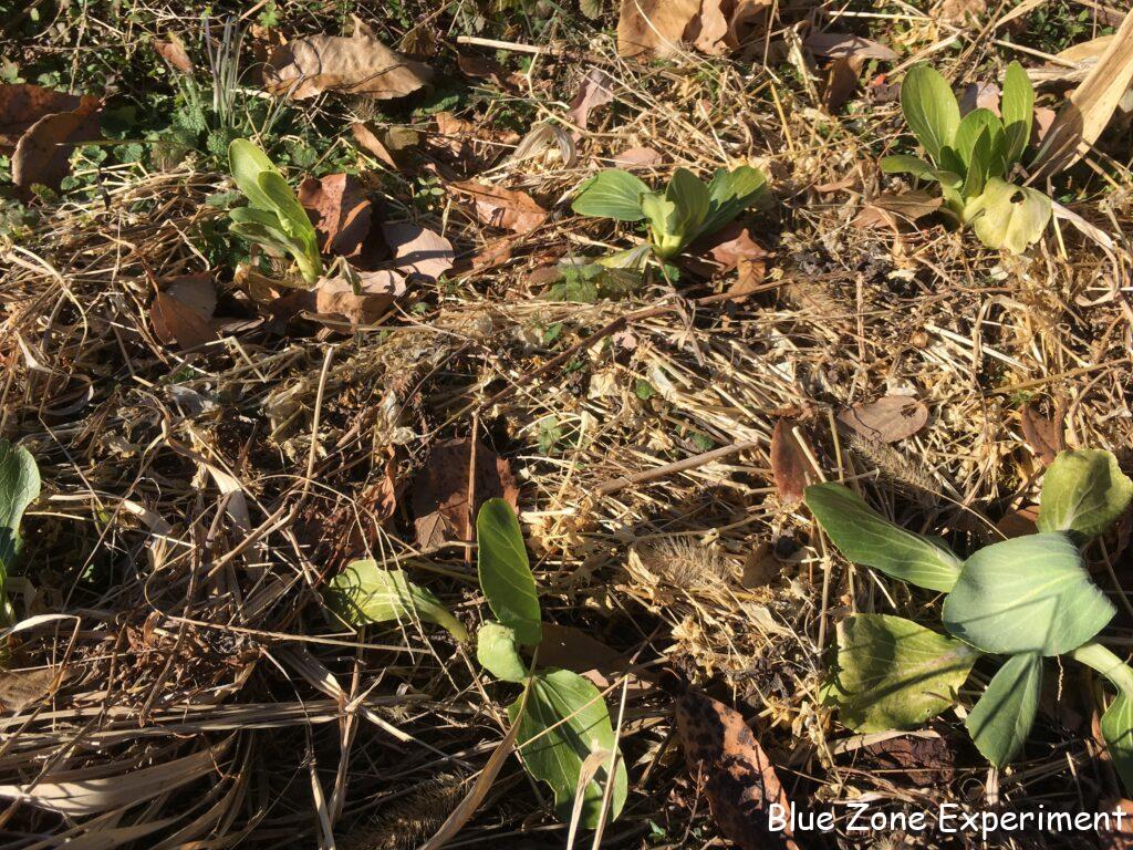 移植したチンゲン菜は、2 週間前には元気でしたが、さすがにこの寒さには耐えきれず、かなり弱っています。もう成長は見込めそうにありません。小松菜は一部霜にやられていましたが、まだ食べられる部分は残っています。小カブやカラシナの葉っぱはまだ大丈夫です。写真にはありませんが、タアサイやビタミン菜は、ほとんど成長はしていないものの、霜の被害はほぼ受けていませんでした。ルッコラやイタリアンパセリ、ケールなども健在です。