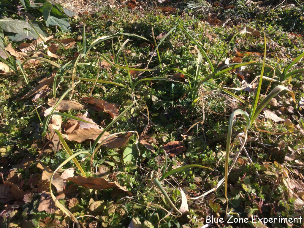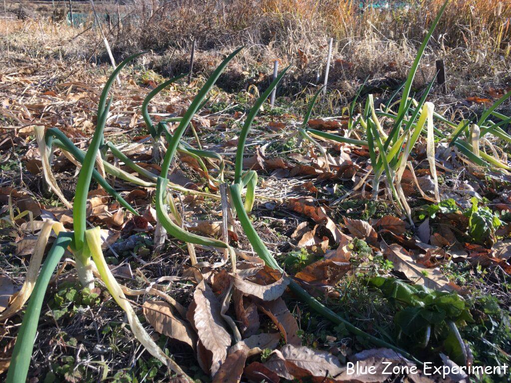 九条ネギは、強い北風を受けて折れ曲がってはいますが、葉先まで青々として元気です。小さな苗を植えたタマネギは、活着はしたもののあまり成長しないままに極寒のときを迎えてしまいました。虫の被害で株数も減っています。ニンニクは今のところ何とかやっています。イチゴは地面に張り付き、葉っぱが枯れてきていますが、株間には冬草が生えているので、少し暖かそうに見えます。一緒に植えたカレンデュラは、この寒さの中、まだ生き残っています。