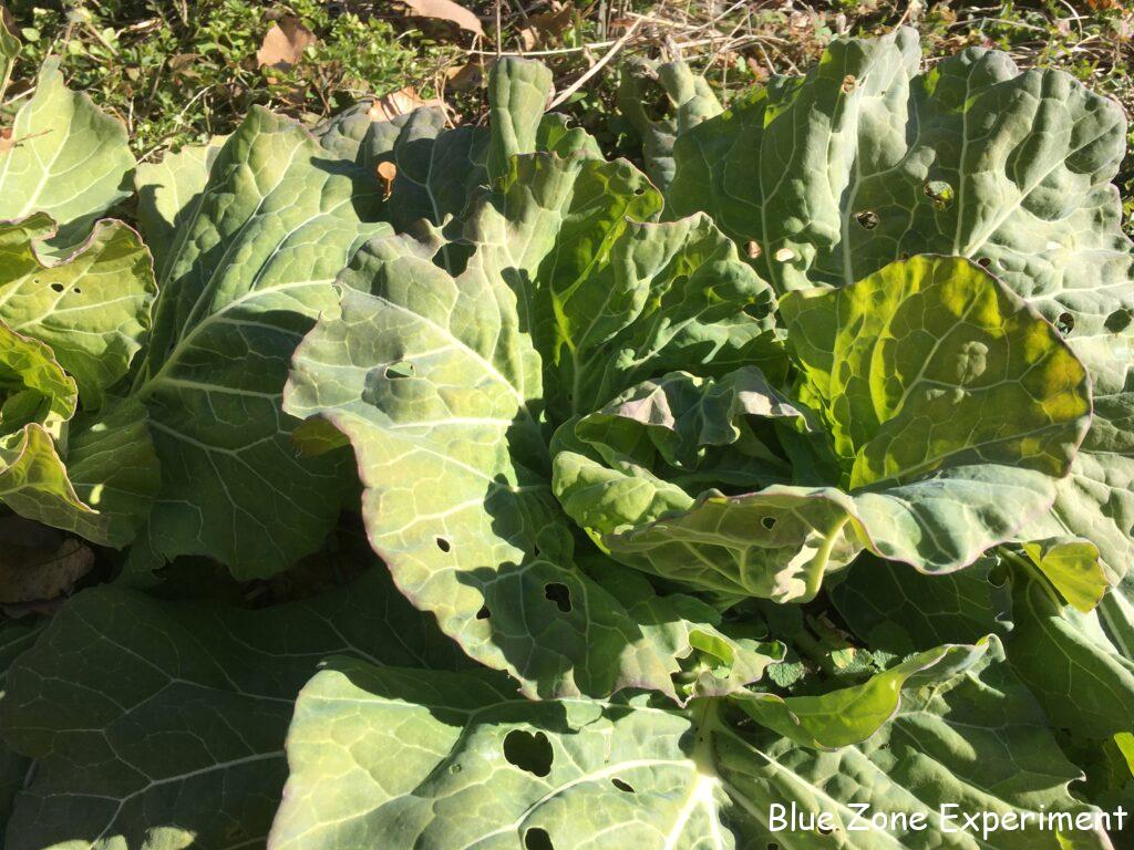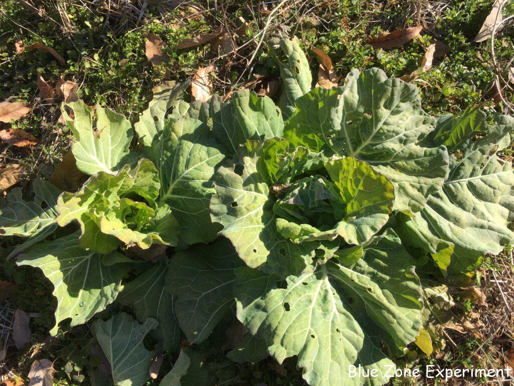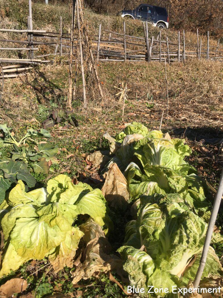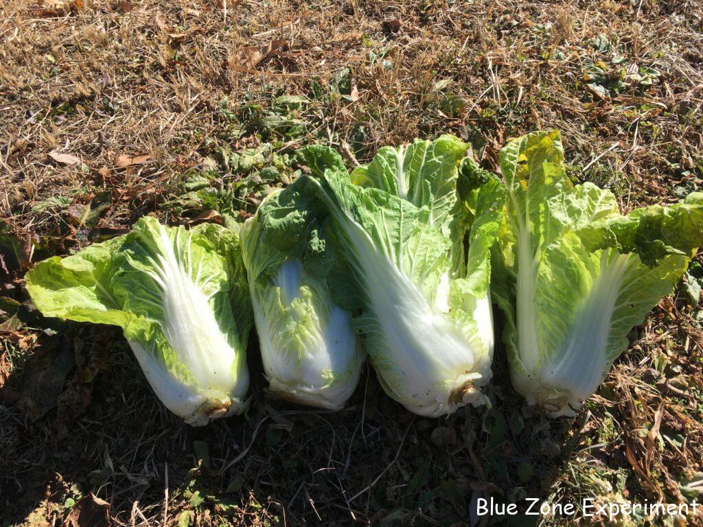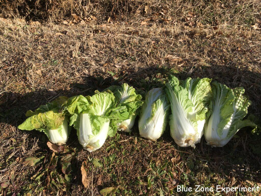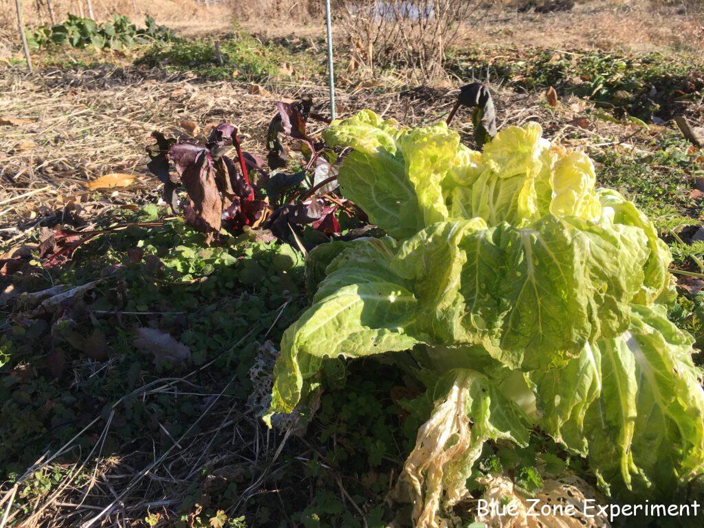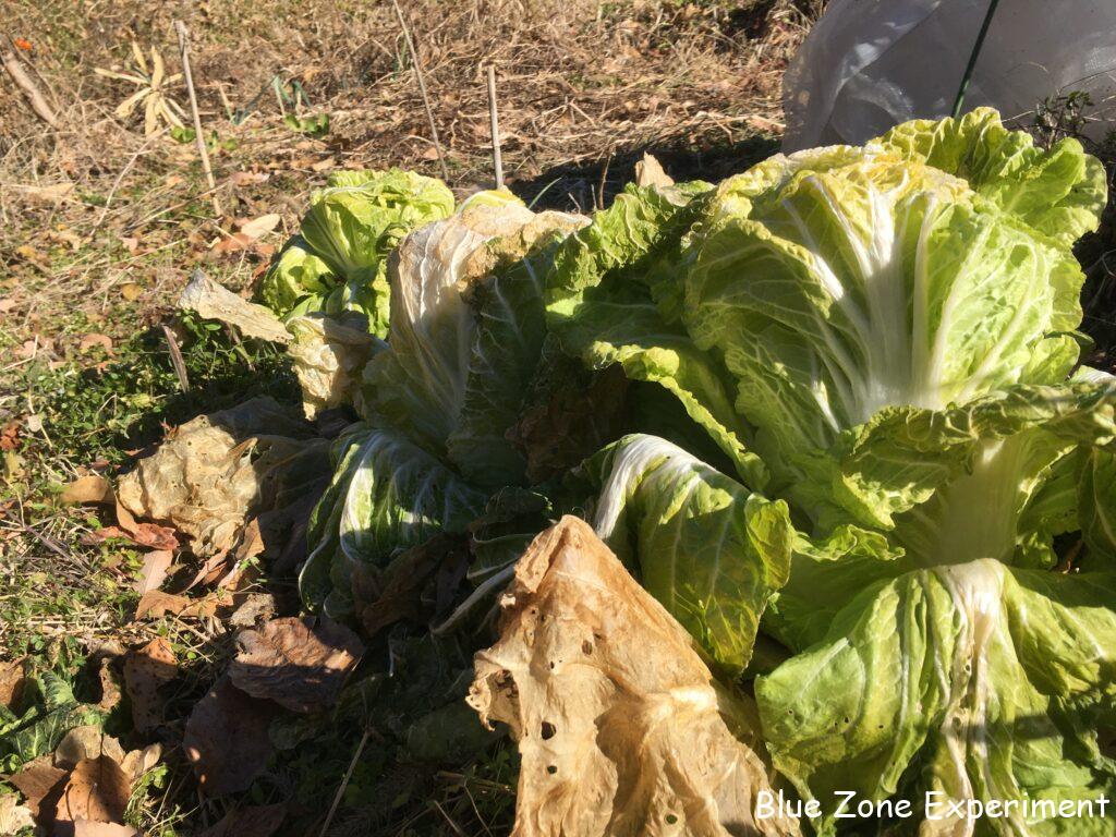 白菜は、このところの寒さで外葉や頂上部分が凍っていました。寒さが厳しく、2 週間ほど前に見たときからあまり成長していませんでした。これ以上置いていても成長は見込めないので、しっかり巻いていないものも収穫してしまいました。ほとんど巻いていないものは、春に菜の花として食べるために畑に残してあります。