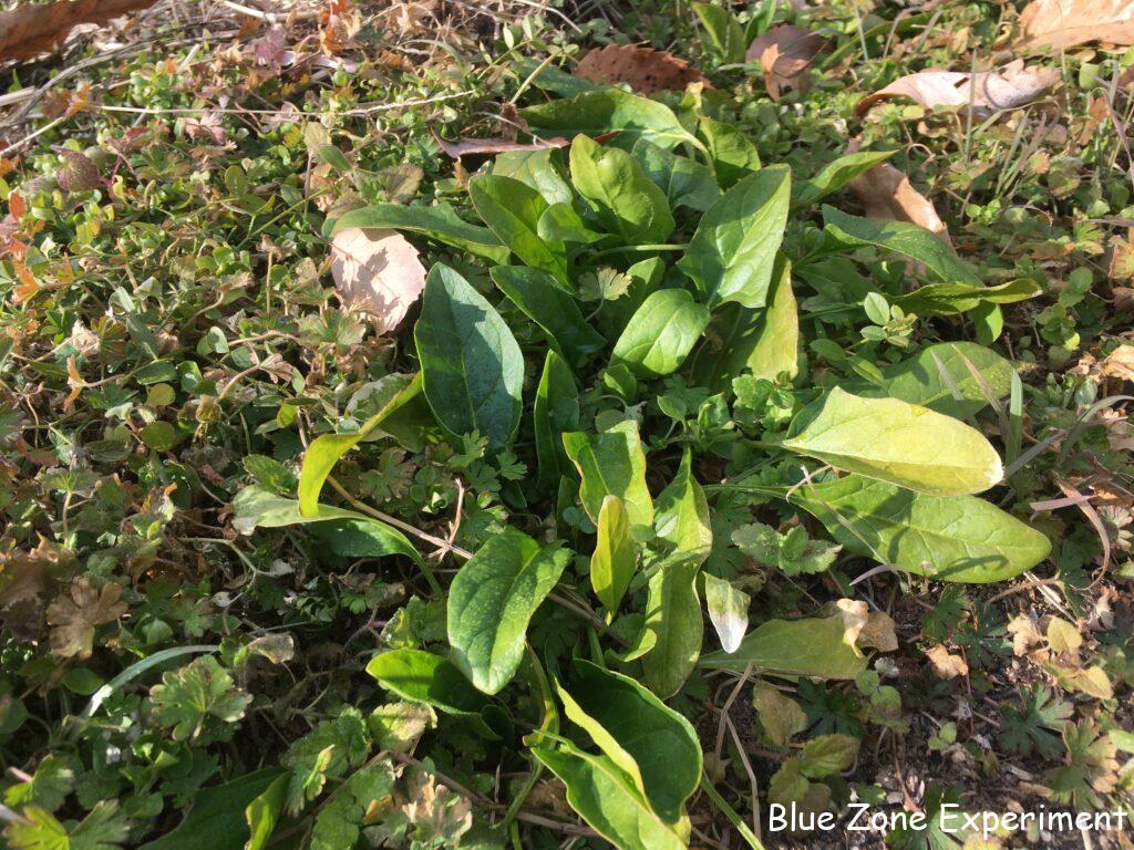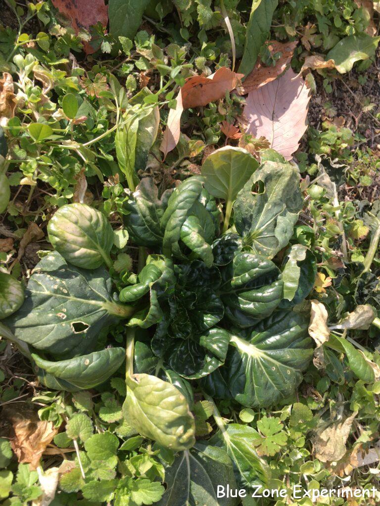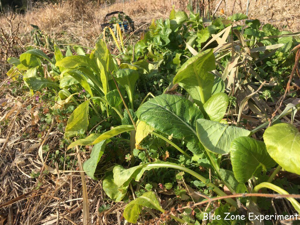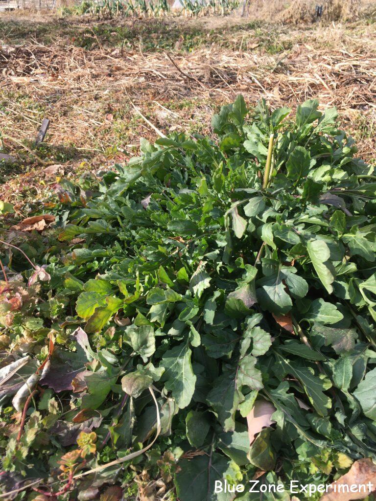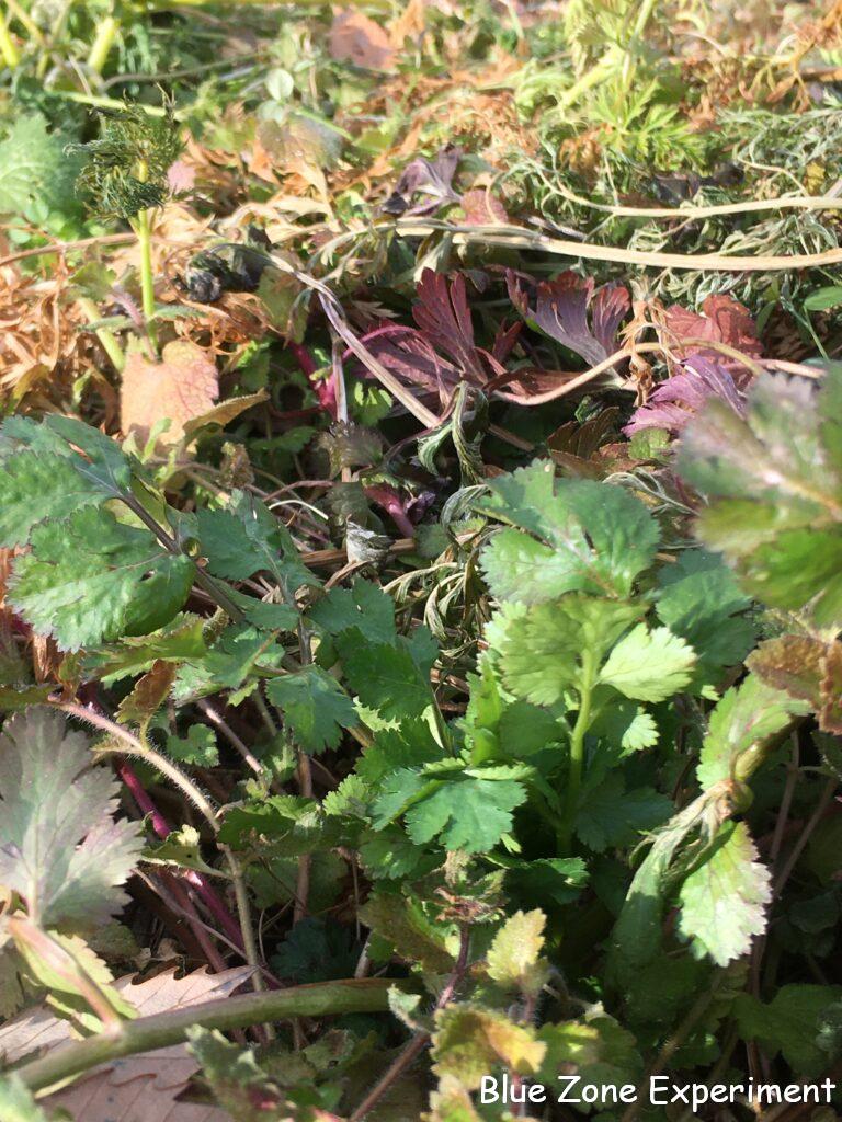 大株のルッコラは、こぼれ種から発芽したものですが、この寒さの中、青々と茂っていて頼もしいです。同じ畝のパクチーは、寒くて色も変わってきていますが、中心からは新しい葉っぱが出てきています。パクチーの奥にはディルがありますが、これは寒さですっかり萎れてしまいました。