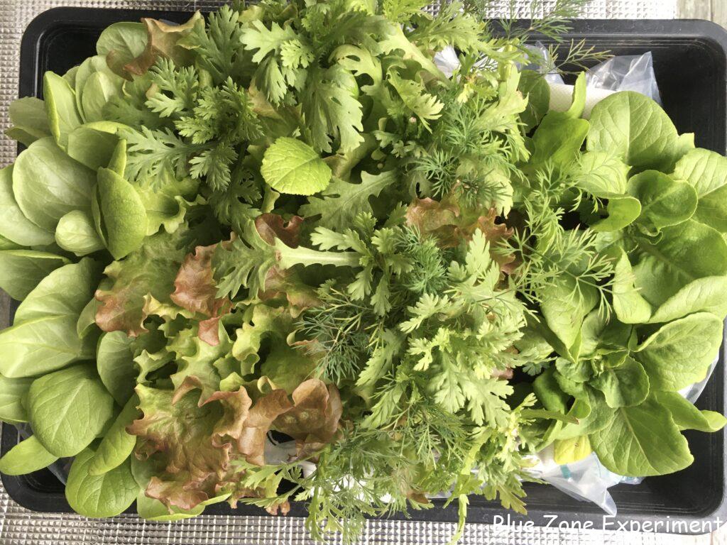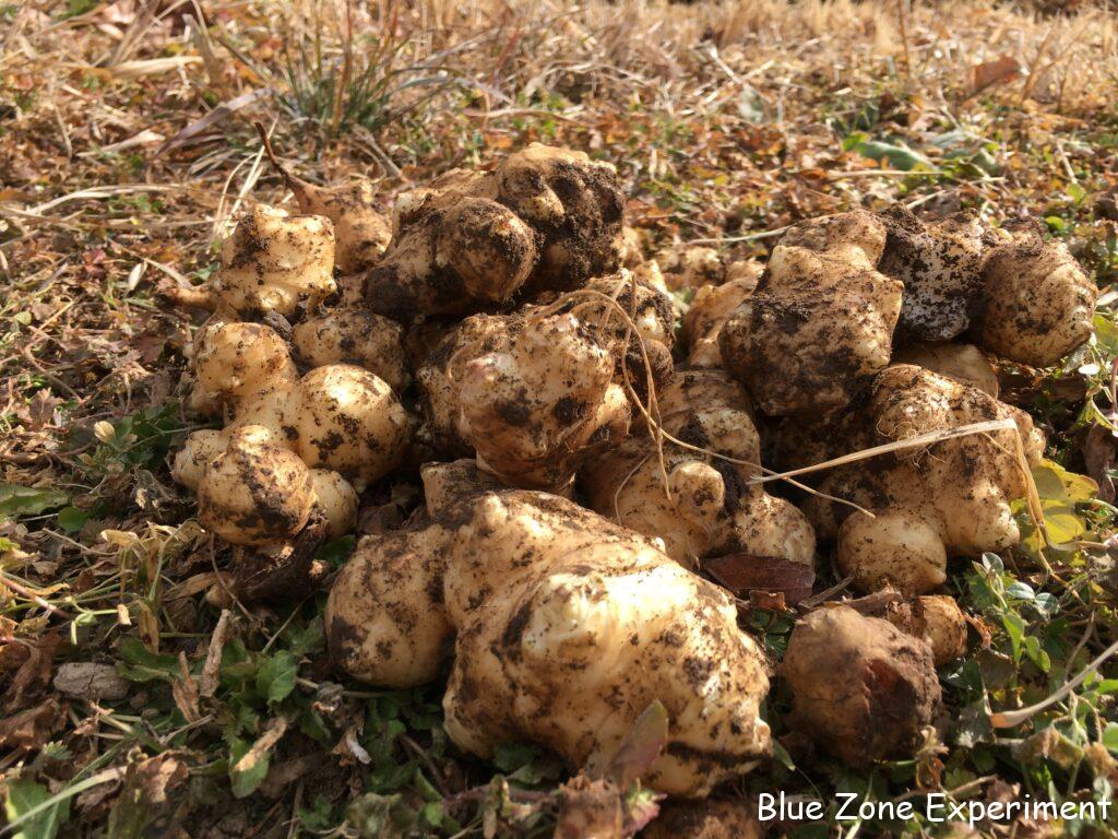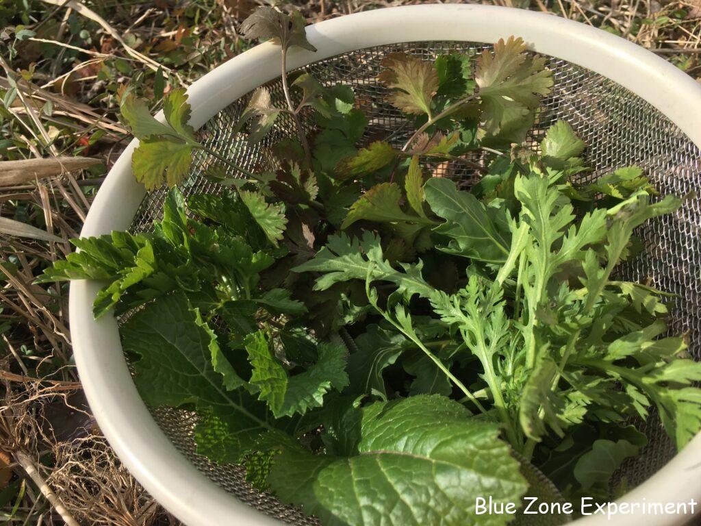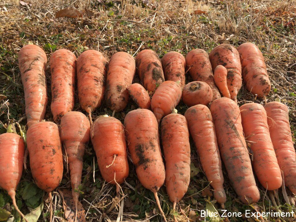 今日は主にニンジンの収獲のために畑に来ました。大きそうなものはだいたい収穫しましたが、まだお楽しみに残してあります。さらに寒くなる年明けにもう一度収穫したいので、凍らないように土や草をかけてきました。今の畑は、広い自然農畑の一角をお借りしているのですが、キクイモは増えすぎるので植えないようにと言われています。その代わり、すでに生えているところのものを収穫してもよいことになっているので、今日は 3 回目の収獲です。育てずにいただけるのはありがたいですが、キクイモは大好きなので、自分の畑にもどっさり植えたいところです。青菜類は、毎日の冷たい強風でかなり傷んでいますが、ケール、小松菜、ビタミン菜を少しずつ収穫できました。ハーブなどは、パクチー、ルッコラ、イタリアンパセリ、セージ、春菊、カラシナをほんのちょっとずつですが採ってきました。どれもサラダなどにほんの少し入れるだけで存在感があり、おいしさが増します。パクチーは、地面に張り付いて寒さに耐えつつ細々と生きていますが、食べてみるとほんのり甘いので驚きました。パクチーの甘みを感じたのははじめてです。寒いと、パクチーさえも糖度を高めて身を守るのですね。