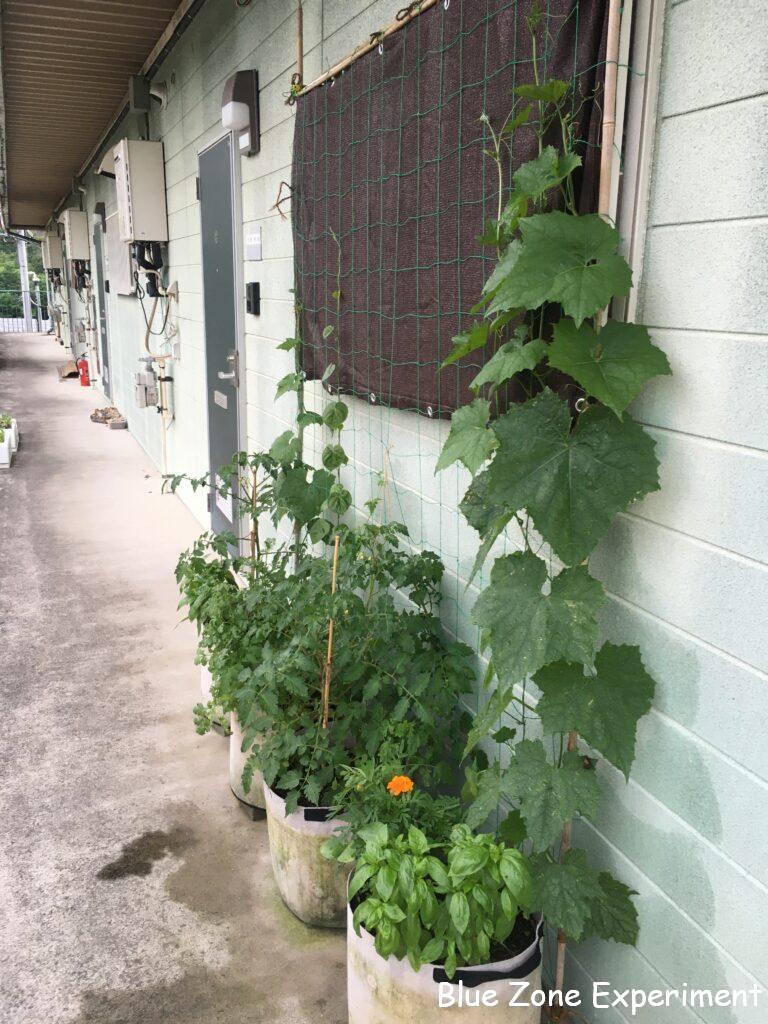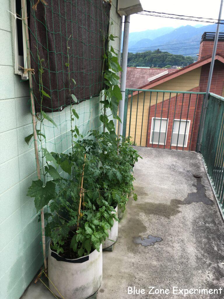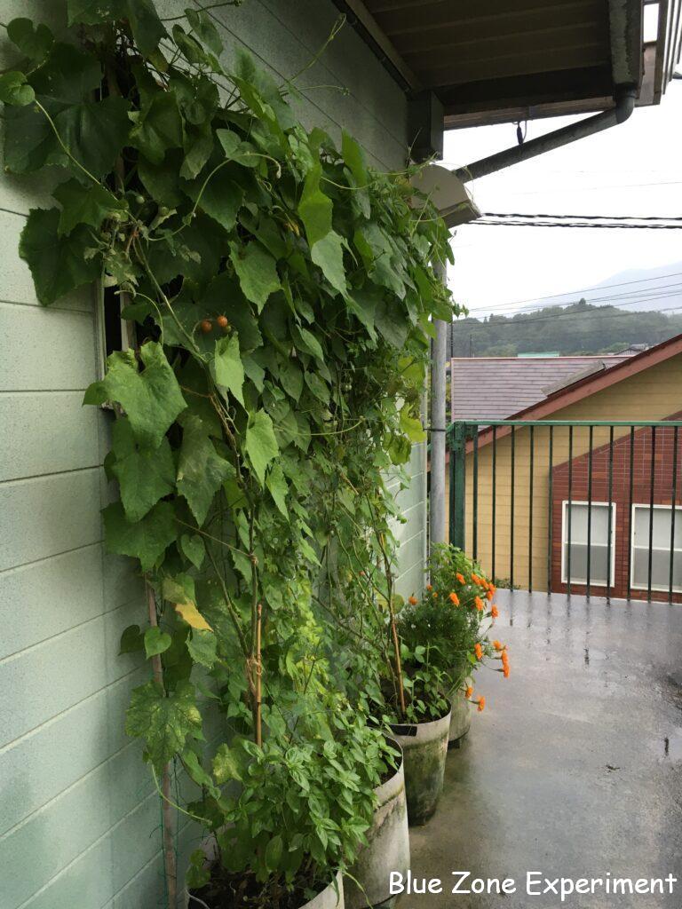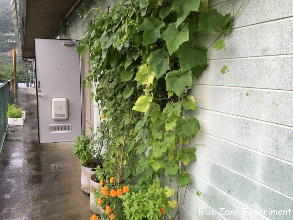 台所の窓から射し込む西日を抑えるために始めたアパートの外廊下のグリーンカーテン。今年 3 回目にして、ようやく日除けとして機能するレベルに到達しました!