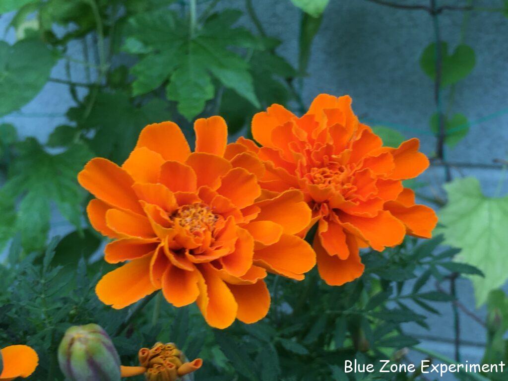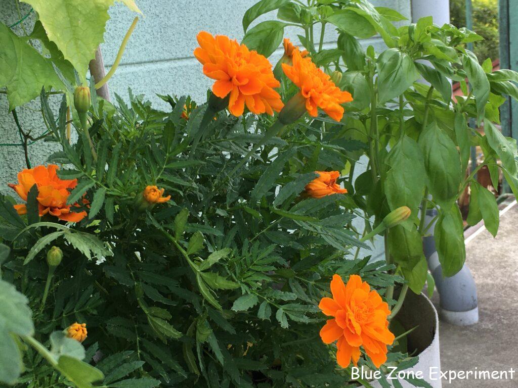 マリーゴールドは、種をまいていないのに勝手に生えてきました。去年畑では栽培していましたが、ポットには植えていないので、どこから混入したのかは謎ですが、花の少ないグリーンカーテンを華やかにしてくれています。