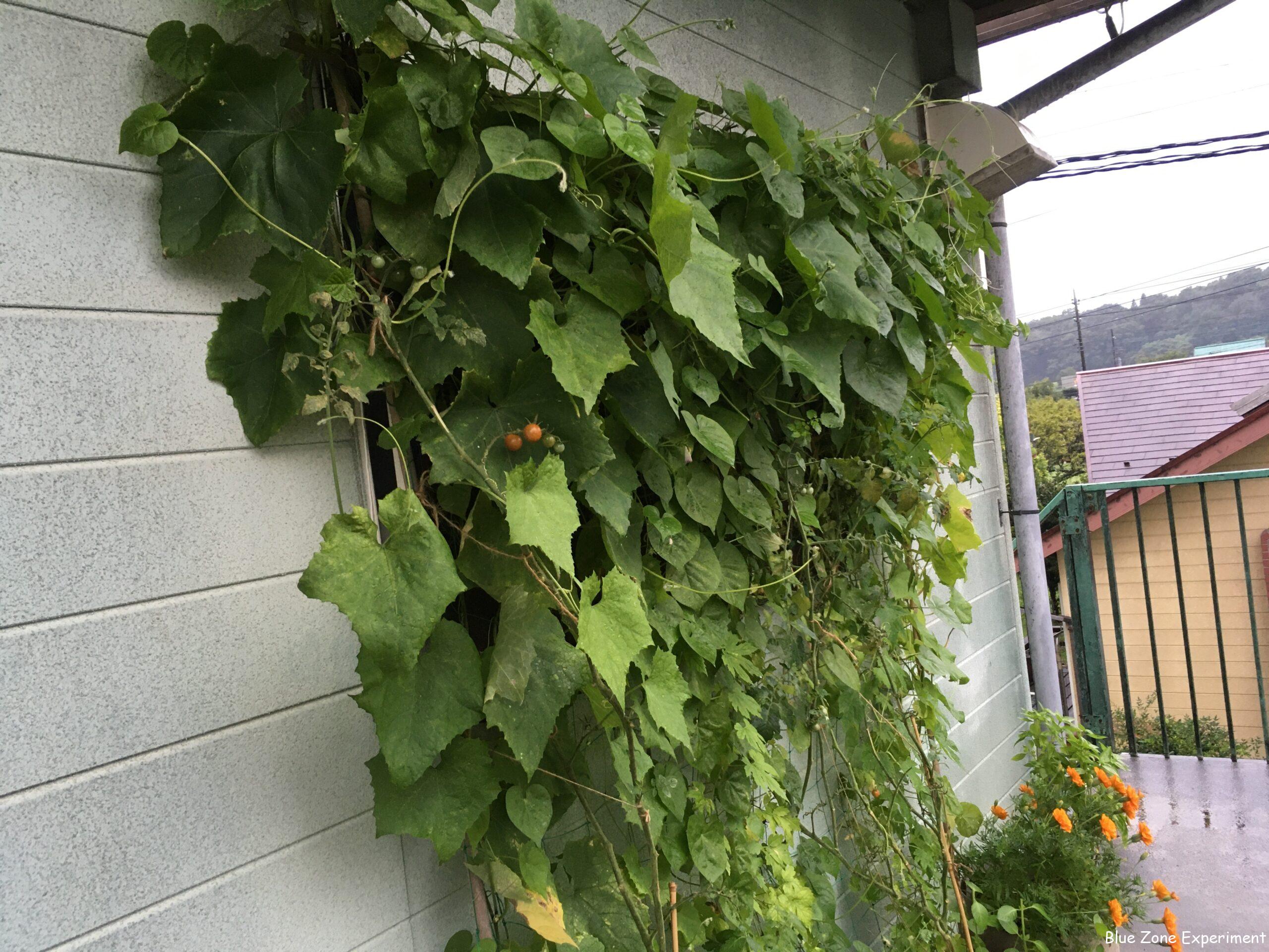 今年はとんでもない猛暑で、標高 600 メートルを超えるわが家でも、室温が 35 ℃を超えるような日が何日もありました。ただ、グリーンカーテンのおかげで、いつも特別暑くなる台所の温度上昇はやや抑えられ、他の部屋と変わらない程度の暑さで済みました(耐え難い暑さであることに変わりはありませんが)。西日が当たる台所の壁は、いつも内側から触っても熱いのですが、今年は、グリーンカーテンに覆われた壁を内側から触ってみても全く熱くなっておらず、明らかに同じ壁の他の部分と温度差がありました。浴室も同じ西側に面しているため、壁がとても熱くなって浴室全体がサウナのようになるのですが、壁全体を植物で覆うことができれば少しは過ごしやすくなりそうです。ただ、そこまで広げるのは大変すぎて現実的ではありませんが。