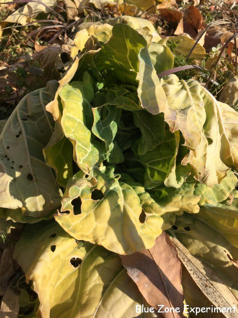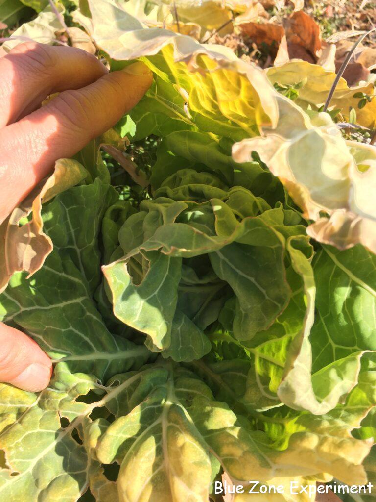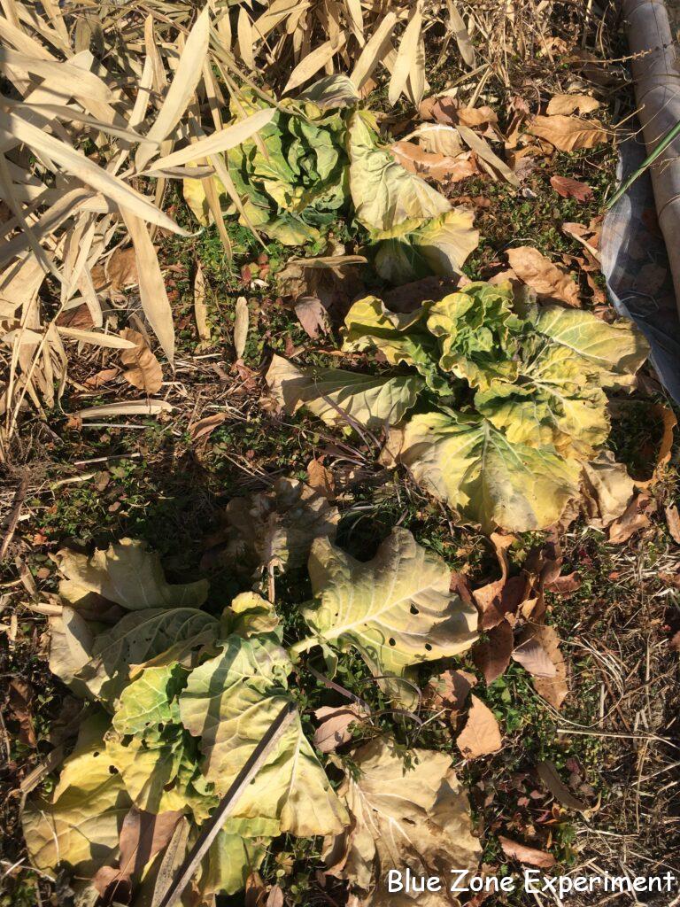 越冬する予定のキャベツは、前回見たときよりさらに黄色くなって、かなり痛々しい様子です。ふんわり中心が巻いている程度で、それほど成長は見られません。