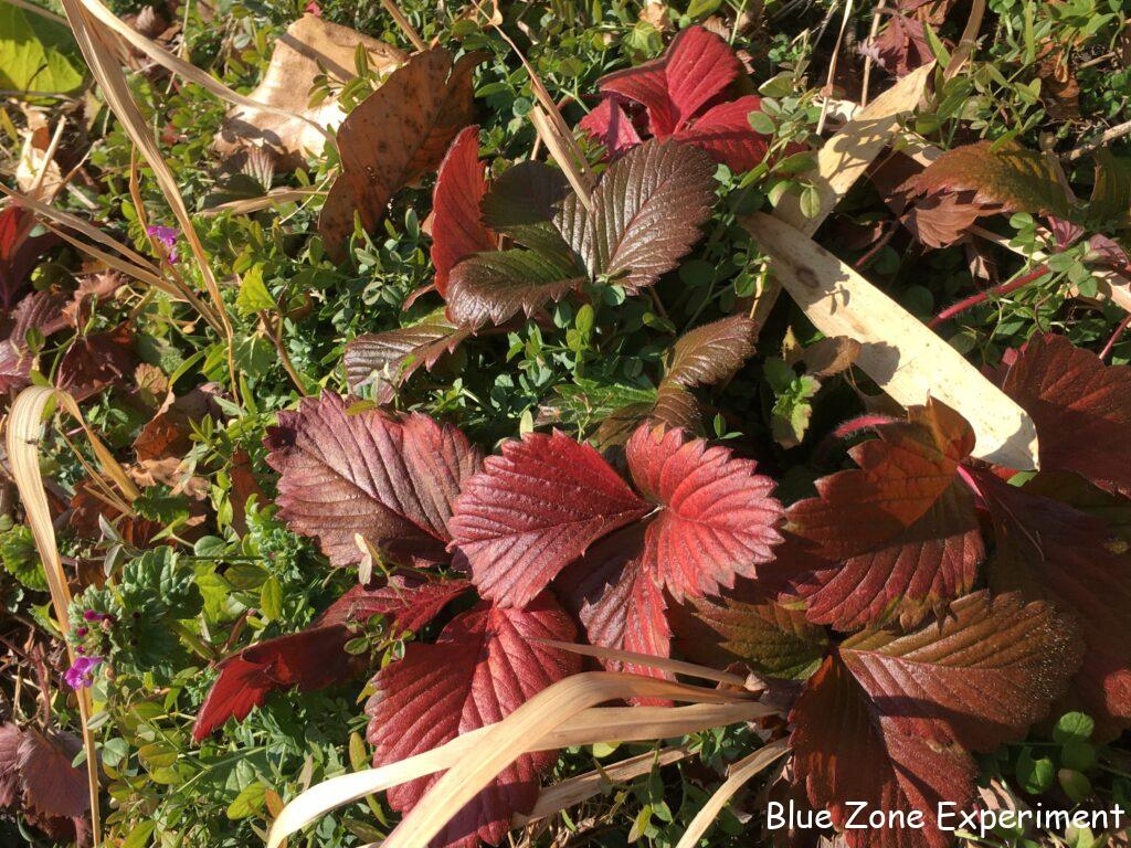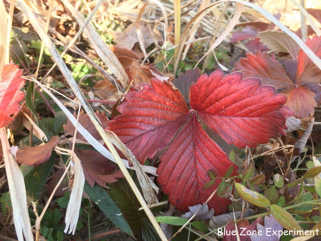 茶色とほんの少しの緑の中、ワイルドストロベリーの真っ赤な葉っぱが目立っていました。